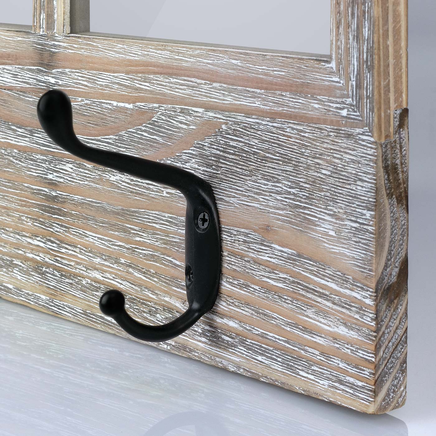 Rustikk collageramme av tre med plass til 3 bilder i bildeformatet 10 x 15 cm. Det sitter 3 dekorative kroker på collagerammens nedre kant hvor du for eksempel kan henge lekker pynt. Collagerammen er laget av tre og har hvitsprukne innslag som gir den et landlig preg. Har veggfeste.