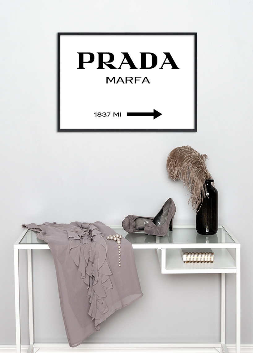 Poster med en veiviser til det permanente kunstverket Prada Marfa, skapt av kunstnerne Elmgreen og Dragset. Installasjonen ble innviet den første oktober 2005 og skal ligne en Pradabutikk. Det svart-hvite trykket passer like godt hjemme hos kunstvennen som hos den som liker moteverdenen og kan med fordel henges sammen med andre plakater med grafiske motiver. Kompletter med en enkel svart eller hvit fotoramme som lar teksten tale og som passer inn i de fleste miljøer.