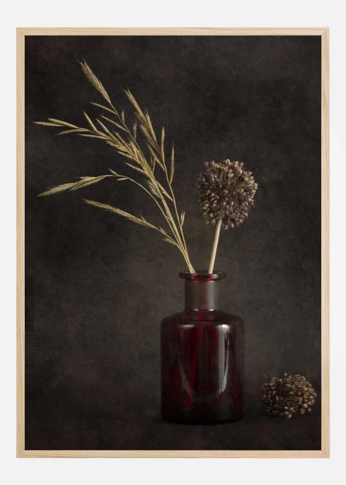En vakker, men enkel plakat med to tørkede gressstå i en glasskrukke. De gulfargede stråene er plassert i en rød krukke mot en brun bakgrunn. Til høyre for krukken ligger et tørket gresstrå ved siden av. En vakker plakat for å tilføre litt farge til en hvit vegg.