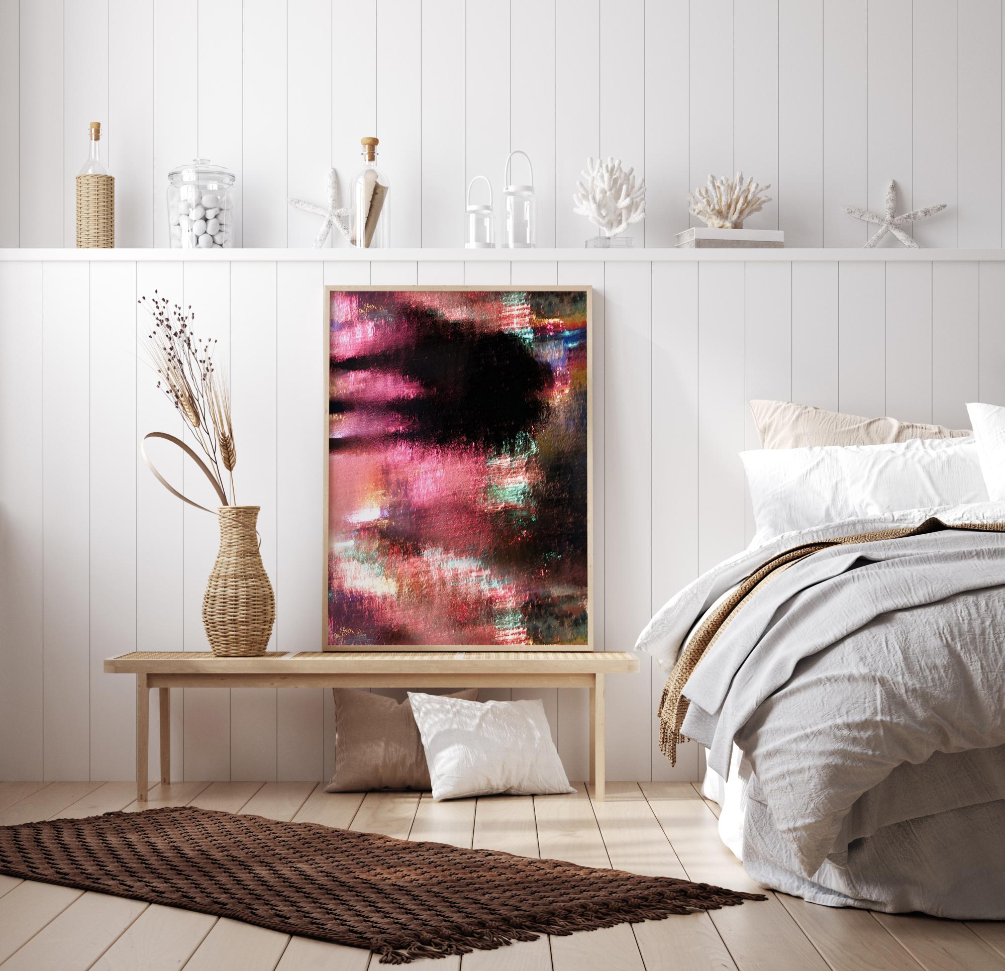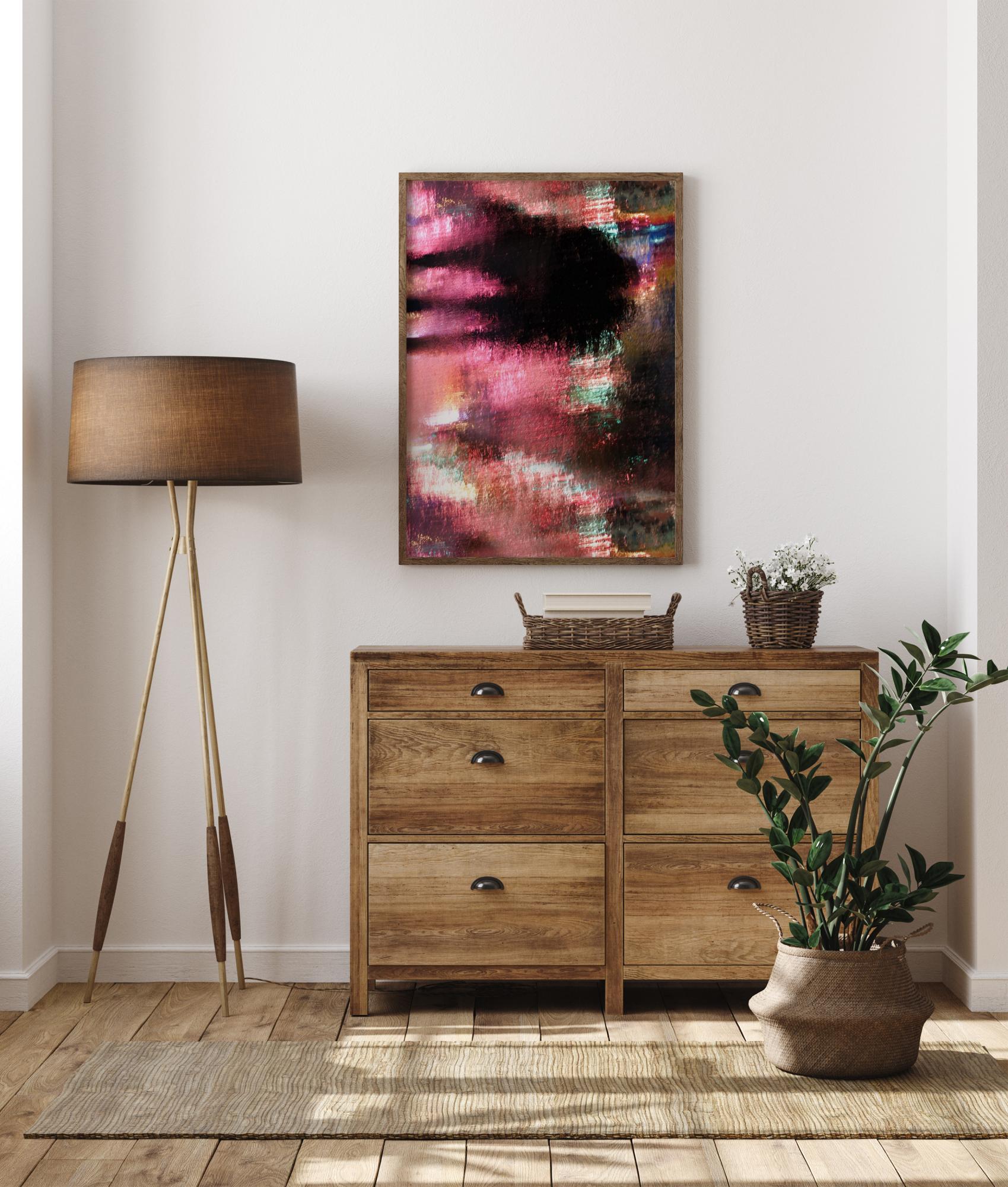 En perfekt blanding av farger med rosa toner dominerer denne flerfargede plakaten. I toppen av plakaten skaper et svart område en følelse av dybde. Til høyre for det svarte området er det en rørlignende form i røde og grønne farger. En perfekt plakat for å legge til et snev av farge til en vanlig vegg.