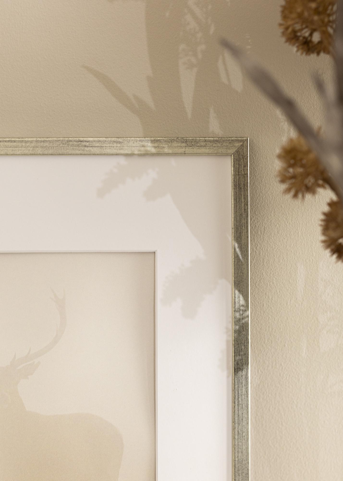Stilig treramme med en rett profil som har en herlig vintagefølelse og en overflate med slitt sølvfarge og svartspettede elementer. Med sin myke og sølvfargede profil er Galant Sølv rammen som passer for nesten alle typer bilder.