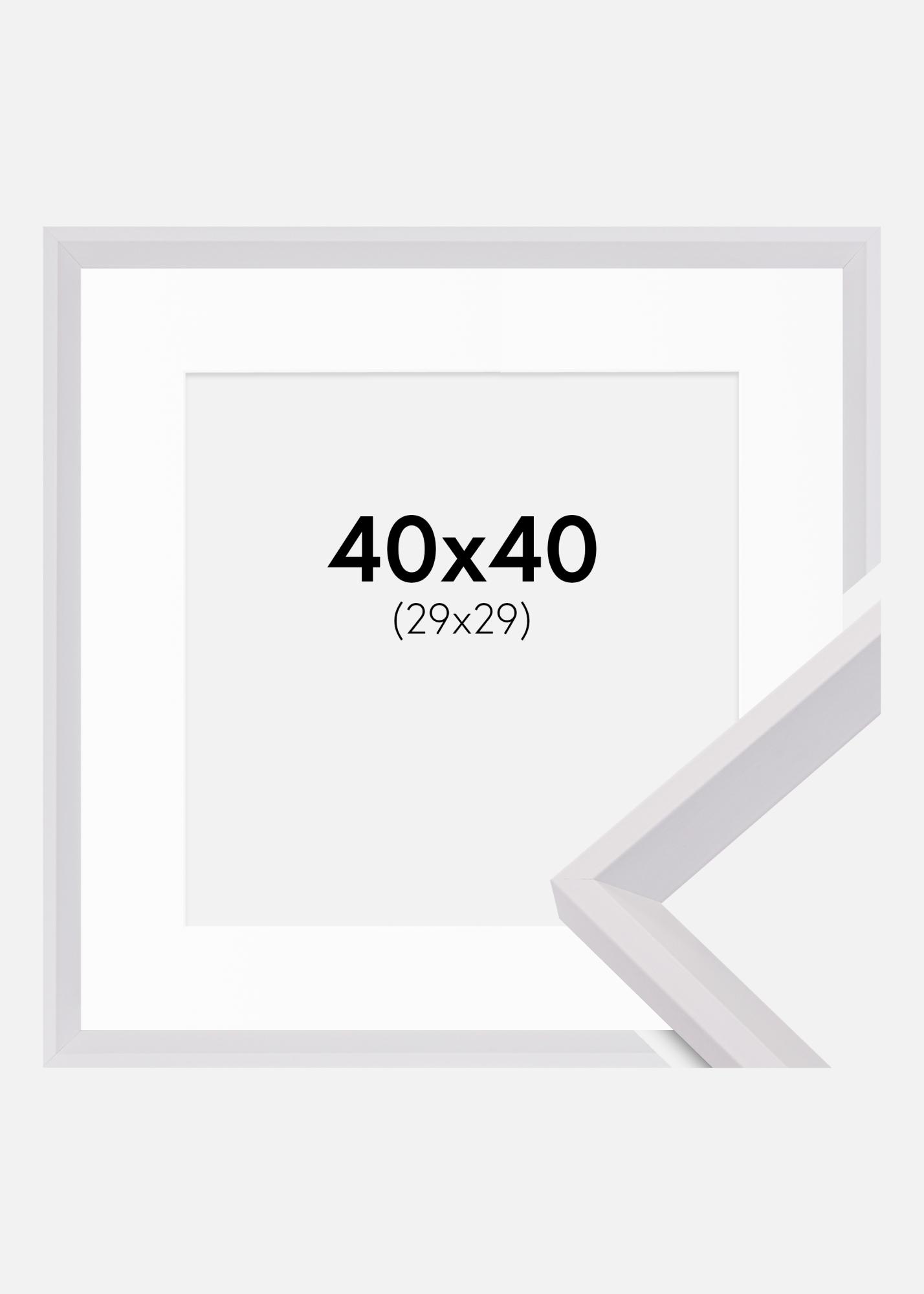 Pakke med bilderamme og passende hvit passepartout. På produktbildet ser du rammens mål (skrevet med fet skrift) og passepartoutens innvendige mål (skrevet i parentes). Merk at passepartoutens innvendige mål alltid må være 1 cm mindre enn ønsket bildestørrelse.