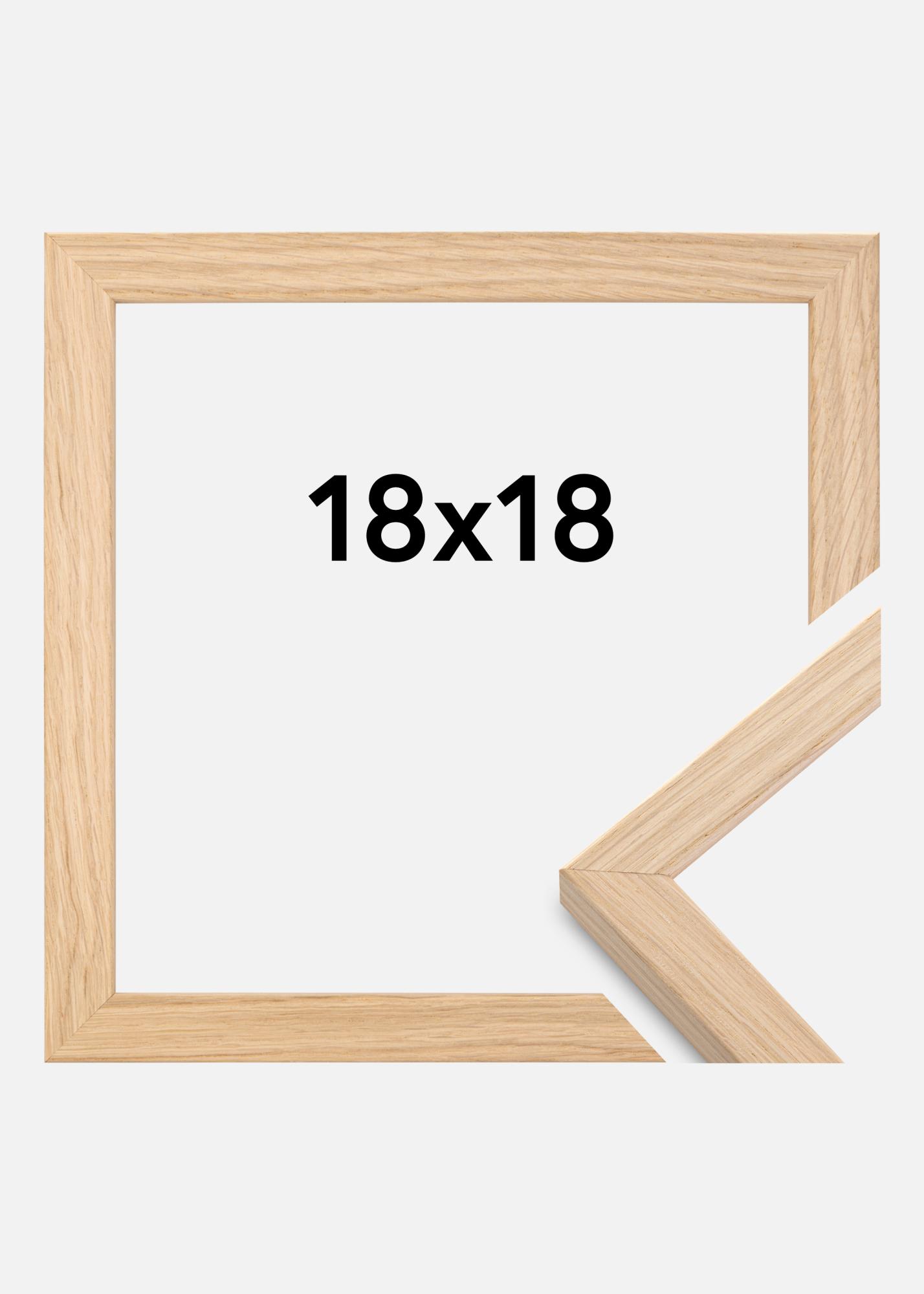 Grimsåker Ramme Eik 22A 18x18 cm har innermålene 18x18 cm mens listen er 1,7x2,25 cm.