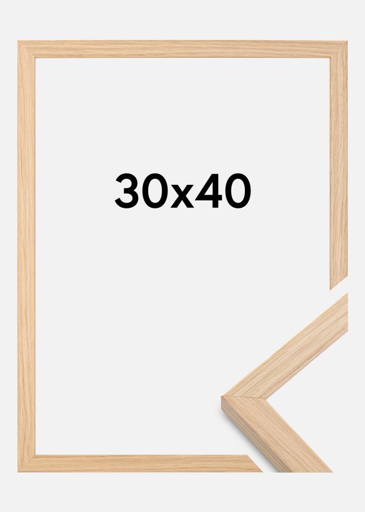 Grimsåker Ramme Eik 22A 30x40 cm har innermålene 30x40 cm mens listen er 1,7x2,25 cm.