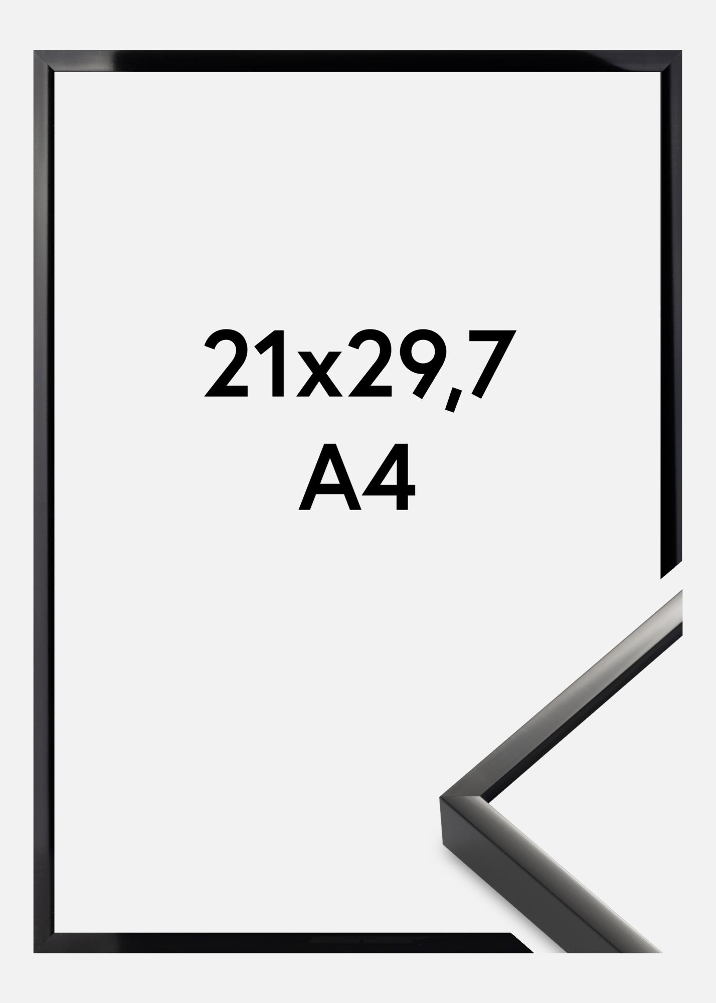 Elegant premium-ramme med en høyblank tynn svart rammelist som passer perfekt inn i et moderne stilrent interiør. Overflaten på rammen og den minimalistiske følelsen i den slanke designen gjør at den er fin å bruke til grafiske plakater og svarthvite fotografier. Bilderammen er laget av aluminium og finnes i mange ulike størrelser, hvilket gør at den er et bra alternativ når man vil skape en bildevegg med bilder i flere ulike format som holdes sammen av ramme valget.
