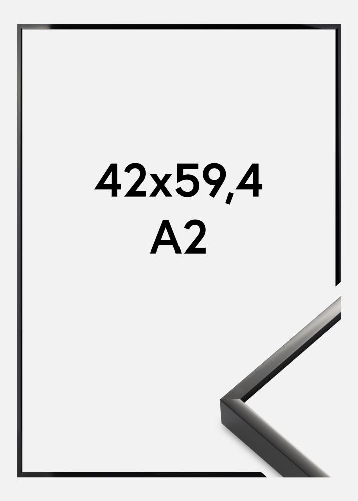 Elegant premium-ramme med en høyblank tynn svart rammelist som passer perfekt inn i et moderne stilrent interiør. Overflaten på rammen og den minimalistiske følelsen i den slanke designen gjør at den er fin å bruke til grafiske plakater og svarthvite fotografier. Bilderammen er laget av aluminium og finnes i mange ulike størrelser, hvilket gør at den er et bra alternativ når man vil skape en bildevegg med bilder i flere ulike format som holdes sammen av ramme valget.