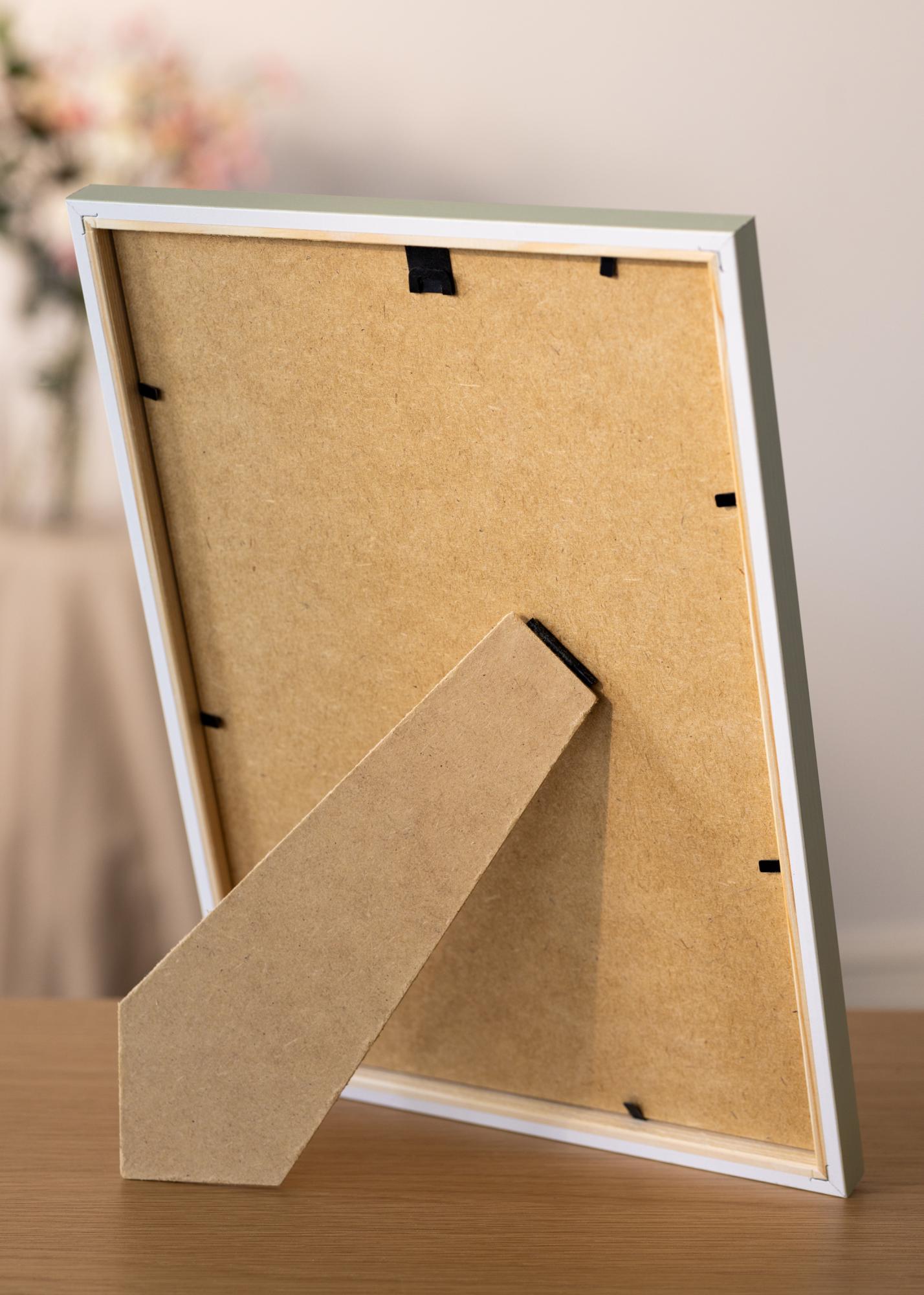Fotorammen kommer med vanlig glass og bakstykket er laget i stabil brun MDF. Rammen kommer også med flyttbart veggfaste som kan bruke til både stående og liggende plassering på din vegg. Monteringen av bildet ditt er med hjelp av bøy bare metallstifter som holder bakstykket på plass.
