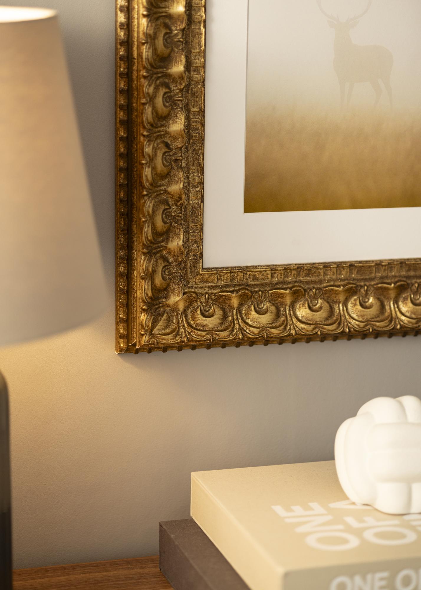 Forvandle dine bilder til kunstverk med vår eksklusive bilderamme Skokloster Gull. Denne fotorammen er designet for å gi minnene dine en elegant innramming med sin klassiske gullfinish og rikt utsmykkede profil. Det antikke utseendet forsterkes av en patinert overflate, noe som gir rammen en tidløs og sofistikert følelse som passer perfekt i både moderne og tradisjonelle miljøer.