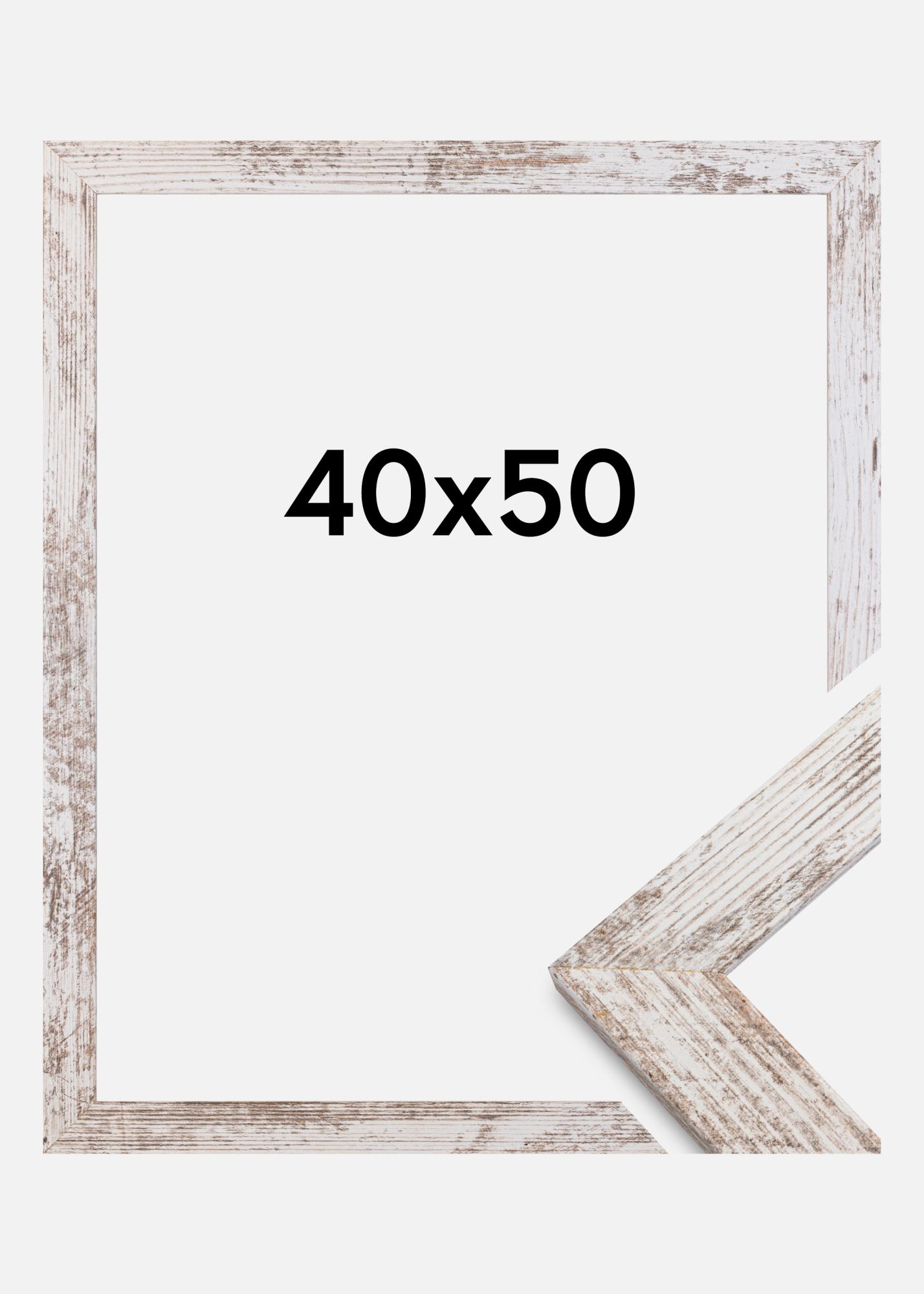Stilig vintageramme med en bred rammeprofil og et slitt utseende i hvitt og tre. Gir en ekstra dimensjon til bildene dine, og passer perfekt når du vil ha ekte vintagefølelse.