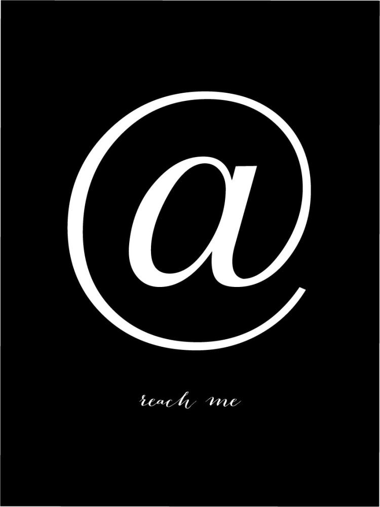 Plakat for kontoret eller den som alltid er tilkoblet og tilgjengelig. Krøllalfa i hvit, stilig skrift, med teksten Reach me som ser håndskrevet ut plassert nedenunder, mot en svart bakgrunn. Trykket passer bra for seg selv, eller på en tematisk vegg med andre motiver. Plakaten ser godt ut sammen med andre typografiske motiver fra samme serie - Ask me, Do me eller Share me.