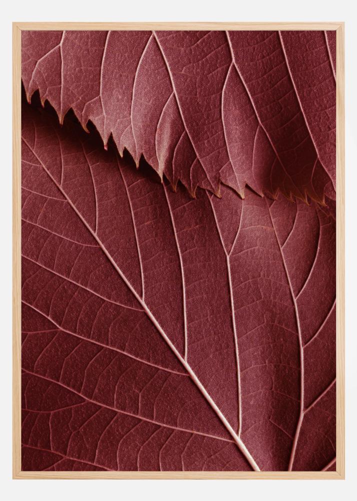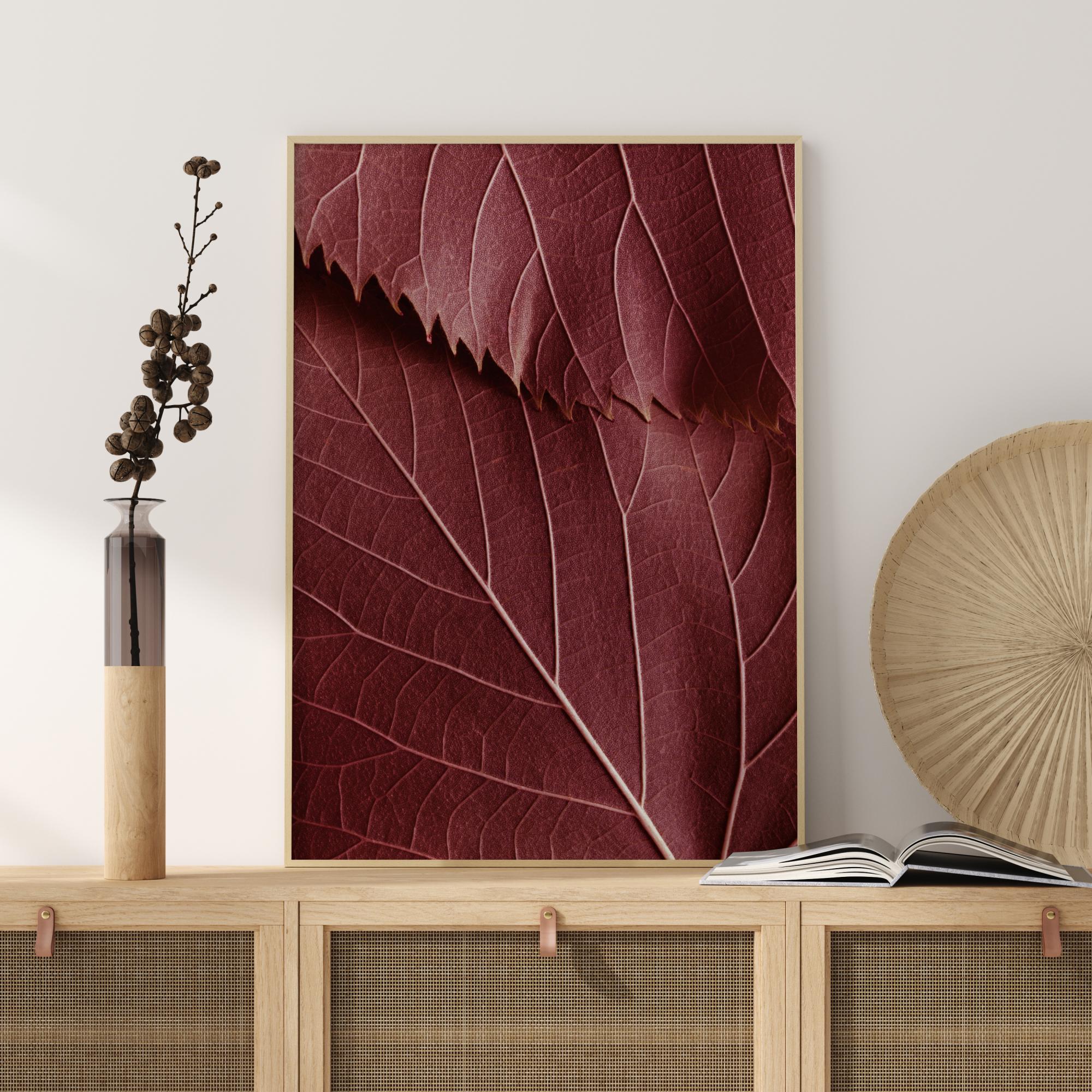 Botanisk fotokunst av mørkerøde blader med livlige mønstre. En stilren poster i varme nyanser i en stil som gjør den perfekt å kombinere med andre herlige motiver på en større bildevegg.