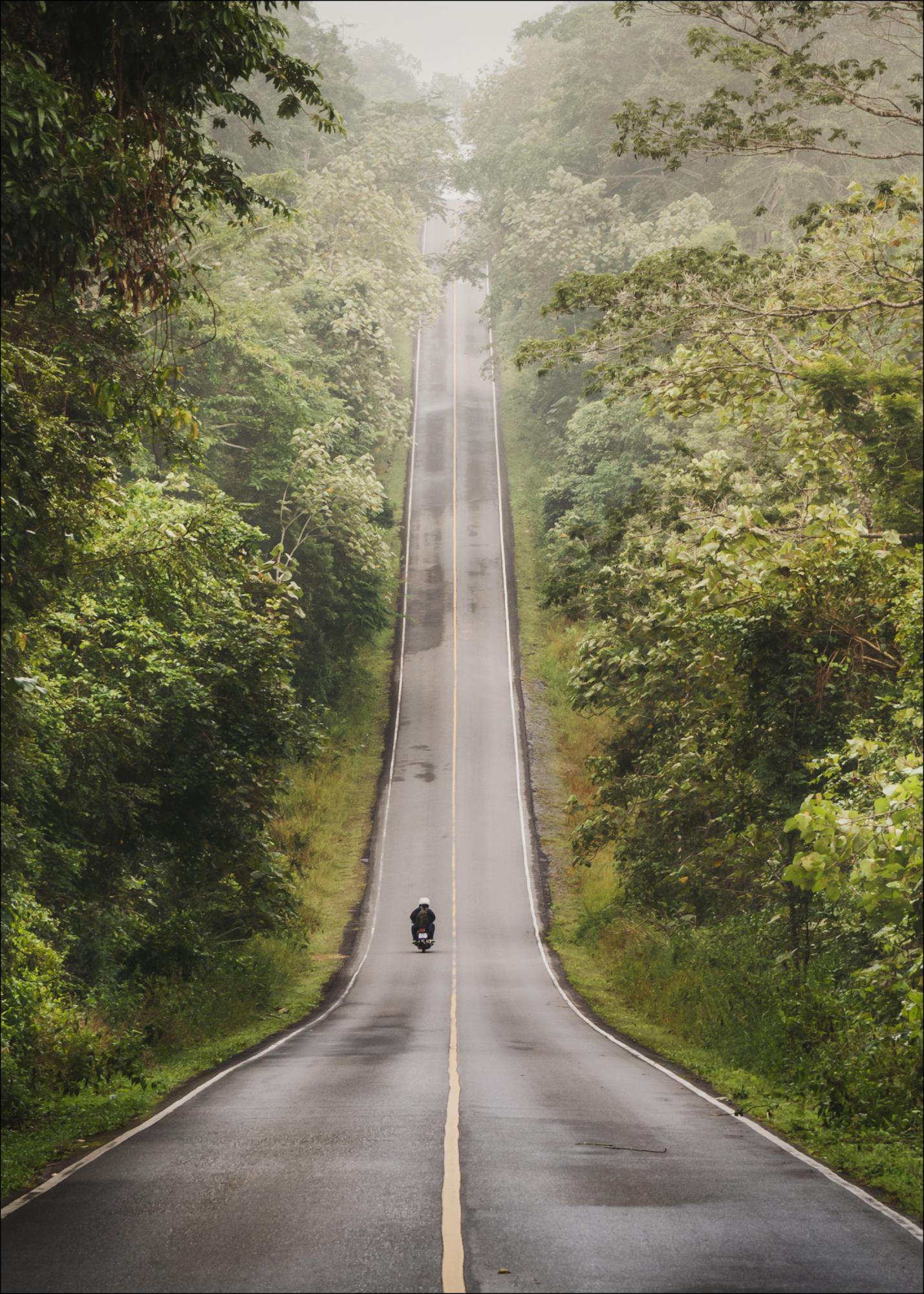Et fredelig naturfotografi av en vei med en ensom motorsyklist som skjærer gjennom deilig frodig grøntområde. En rolig og beroligende poster som passer utmerket sammen med andre favoritter på en større bildevegg.
