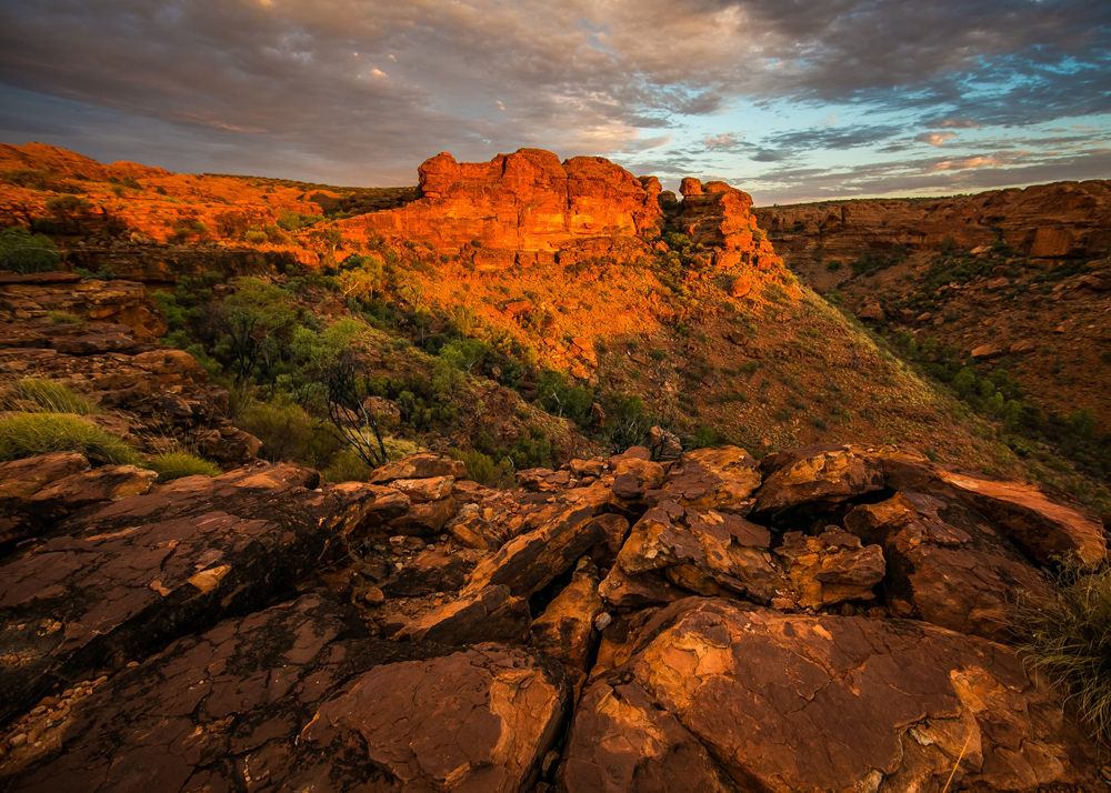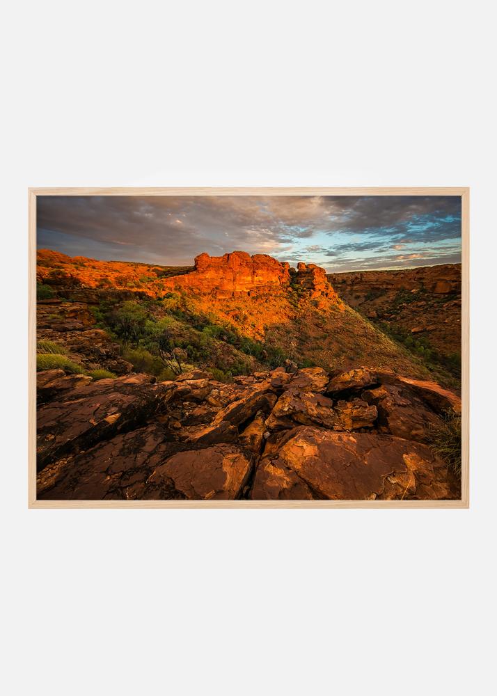 Plakat med fotografi av øde, røde fjell i solnedgang. Noe for de som liker å ha ørkener og fjellformasjoner hengende på veggen. De varme, røde tonene mot den isblå himmelen og dybden i bildet skaper et veldig dynamisk motiv. Ram bildet inn i en stilig fotoramme og heng på en vegg sammen med andre ørkenmotiv.