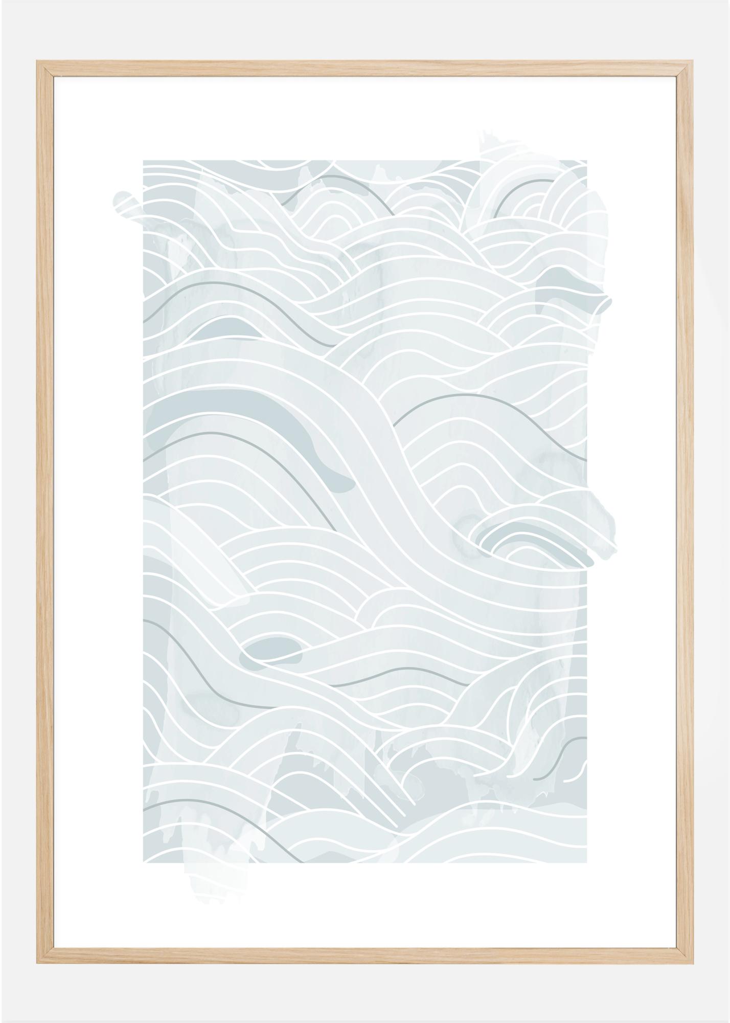 En havplakat med myke blå abstrakte linjer og bølger på en hvit bakgrunn. Ulike toner av blått og ulike linjetykkelser kombinerer flott for å danne disse bølgene på tvers av siden. La tankene dine vandre og bli feid bort med dette myke havdesignet.