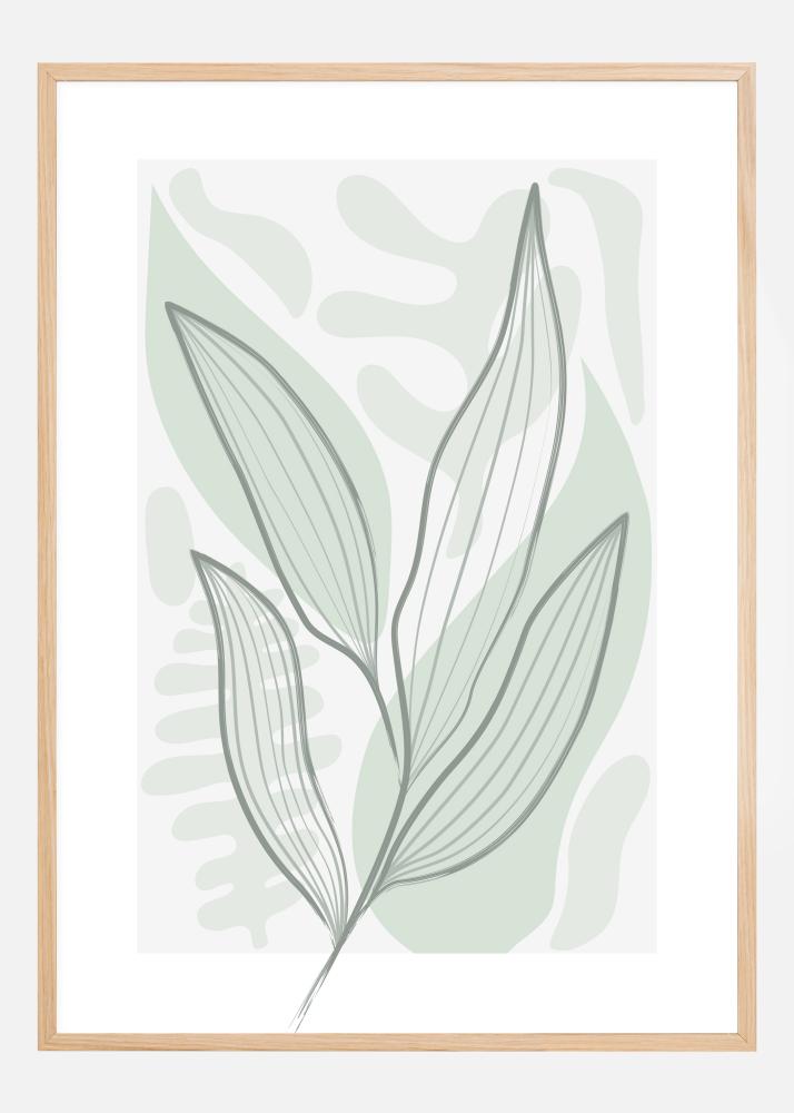En abstrakt plakat med blader på en enkel grønn bakgrunn, av forskjellige løvaktige former og design. Ved hjelp av myke grå og grønne toner avgir det enkle bladdesignet, som er skissert i en sterk grå linje, en sterk vårlig stemning for en myk følelse. Denne plakaten tar seg godt ut i alle husets rom.