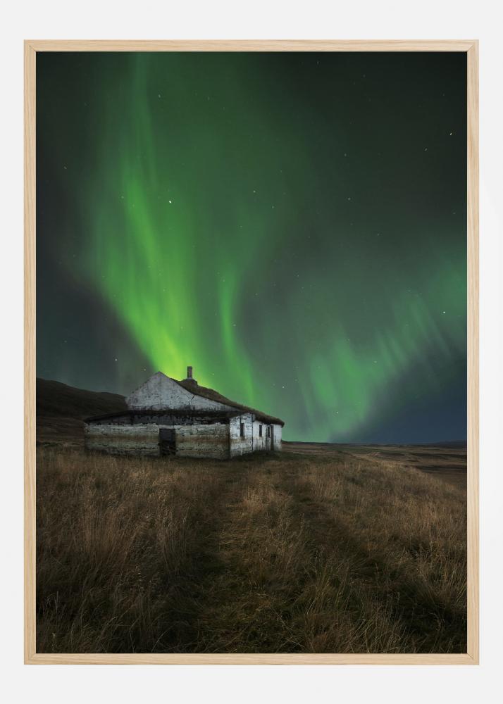 En fantastisk plakat med lysegrønt og gult nordlys over et lite hvitt hus. Nordlysets sterke farger ser ut til å bevege seg, og flimrer når du betrakter denne fascinerende scenen. Ta del i naturenes storhet og bring dette naturlige fenomenet inn i huset ditt for eterisk skjønnhet.