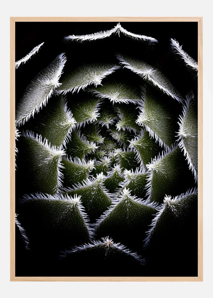 Et makrobilde av en semipervivum rosett. Nærbildet av denne planten viser rosetten av dype grønne blader, hver av dem fjæret med små hvite pigger. Detaljene er utrolige, og vil få alle til å ta en pause ved denne fantastiske plakaten.