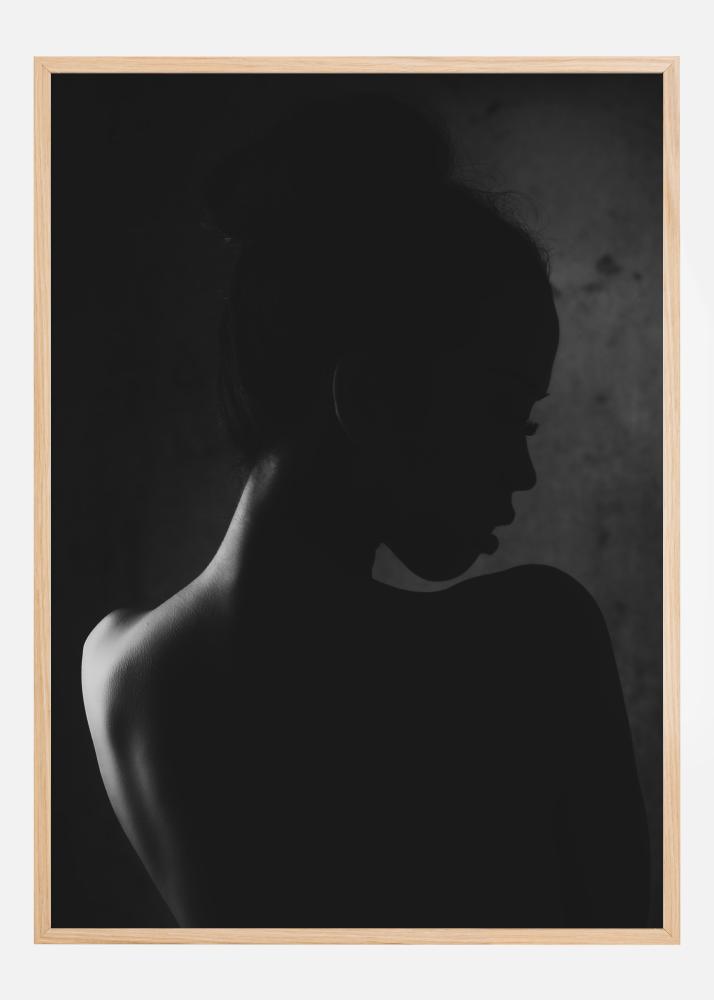 En mystisk portrett-plakat med en ung kvinne med ryggen vendt mot kameraet. Opplyst fra venstre side, er skulderen hennes fremhevet i en hvit glød, mens resten av henne faller i skyggen. Med delte lepper, vrir hun på hodet for å se tilbake på deg over skulderen sin i dette sensuelle bildet.