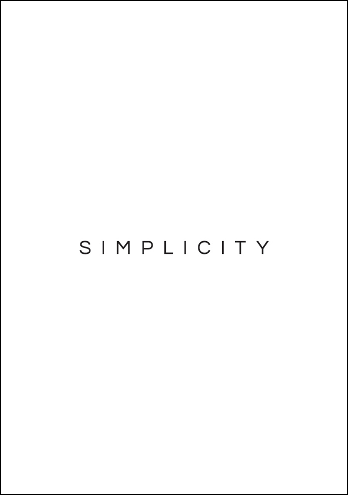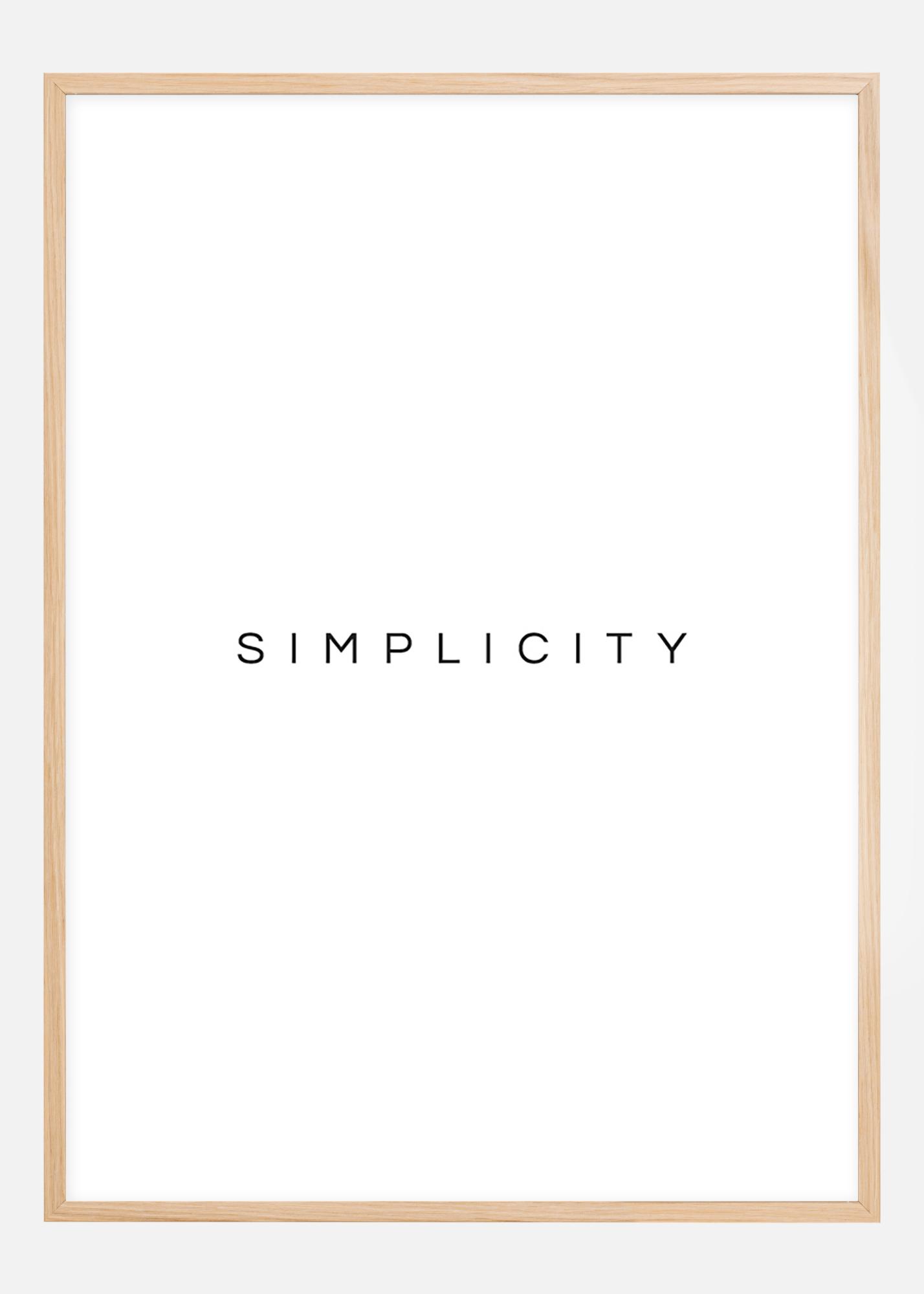En minimalistisk tekstplakat med ordet «Enkelhet» skrevet i svart i midten av dette hvite bildet. Ingen spennende skrifttyper her; som ordet antyder, er alt her enkelt. Behold den minimalistiske stemningen og heng dette på en vanlig vegg for å følge rådene i denne plakaten.