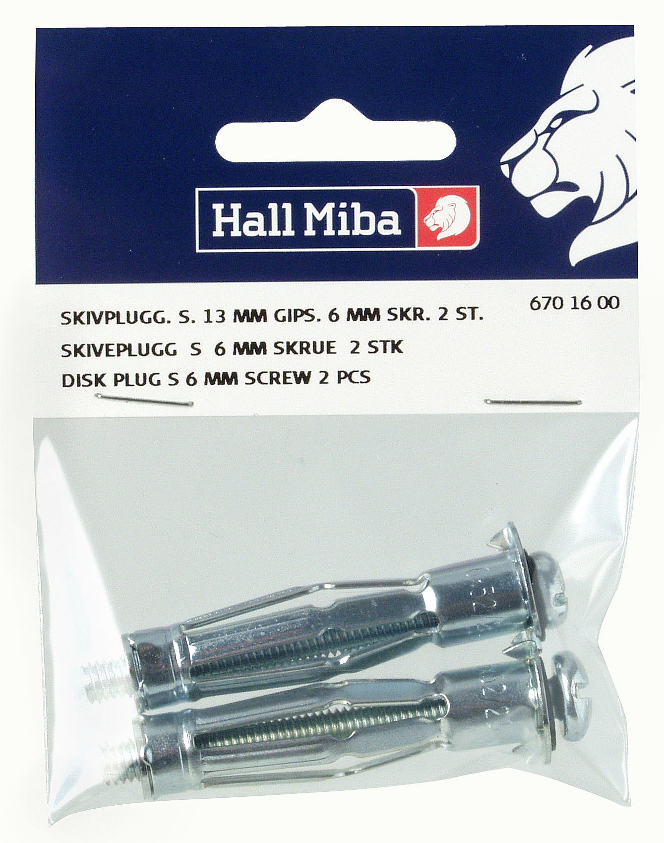 2 stk. plateplugger og M6 skruer til 13 mm gipsvegg. Sporet i platepluggen passer til en skruedimensjon på 10 mm.