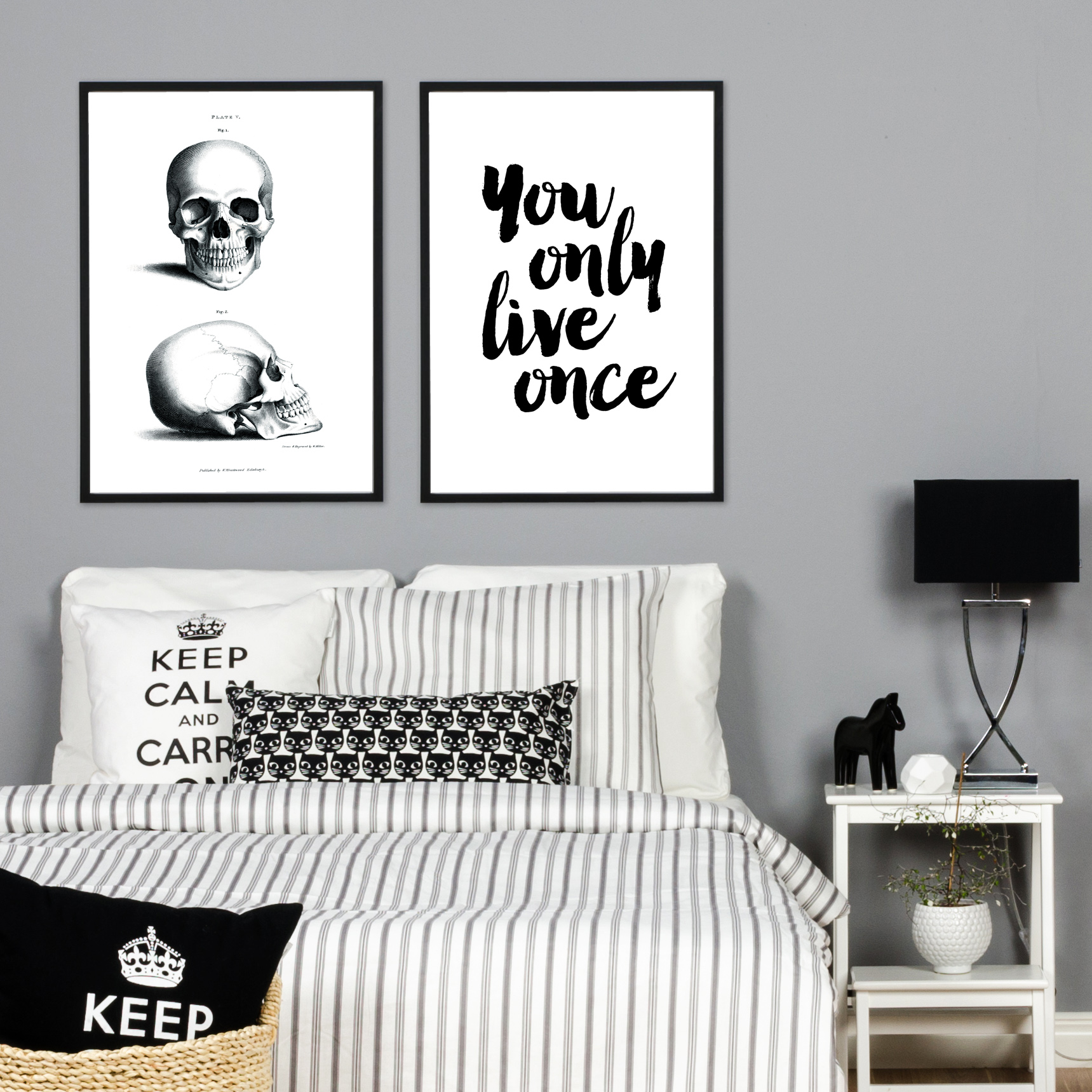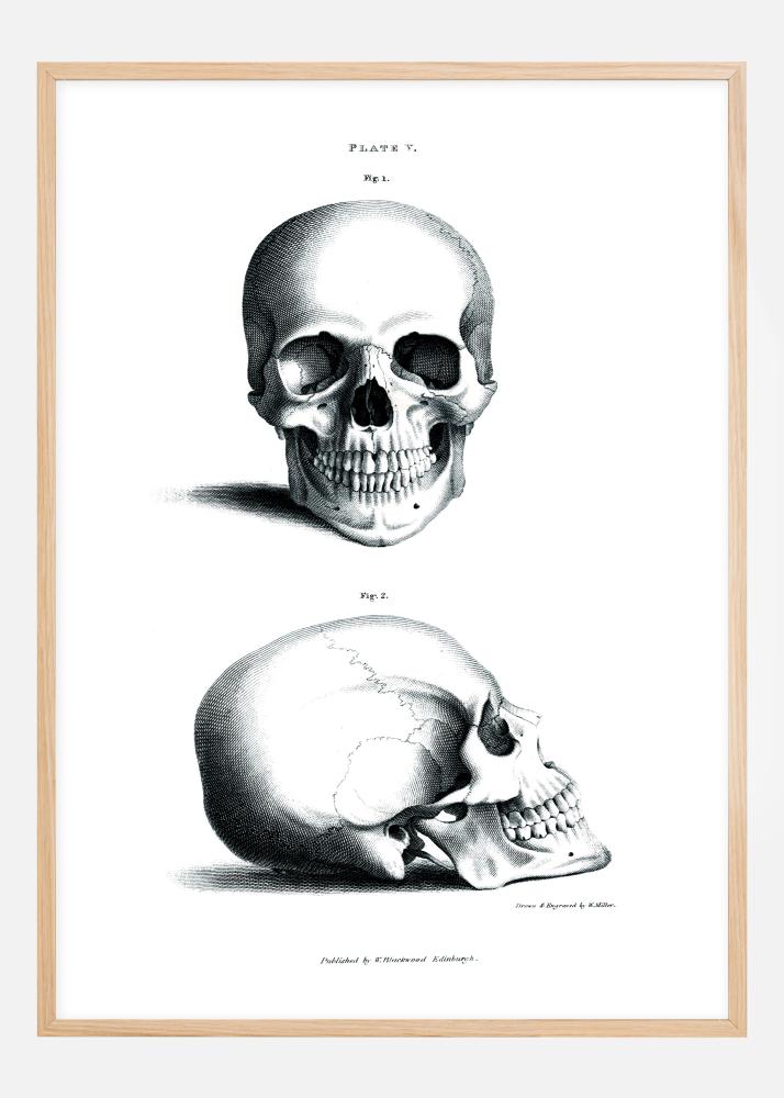 Ikke vær redd for å henge opp plakater med en anelse makabre motiver når du dekorere - alt avhenger av hvordan du kombinerer dem! Denne stilige plakaten er hentet fra en gammel lærebok utgitt på 1800-tallet. Illustratøren het William Miller og han var en fremgangsrik gravør. Motivet viser en hodeskalle sett forfra og fra siden, med svært vellagede detaljer. Under motivet finner du gravørens navn, samt informasjon om utgiveren. Ettersom plakaten er svarthvit funker den like bra med en svart ramme som med en fargerik. Den finnes i flere ulike størrelser så du finner enkelt en som passer ditt hjem.