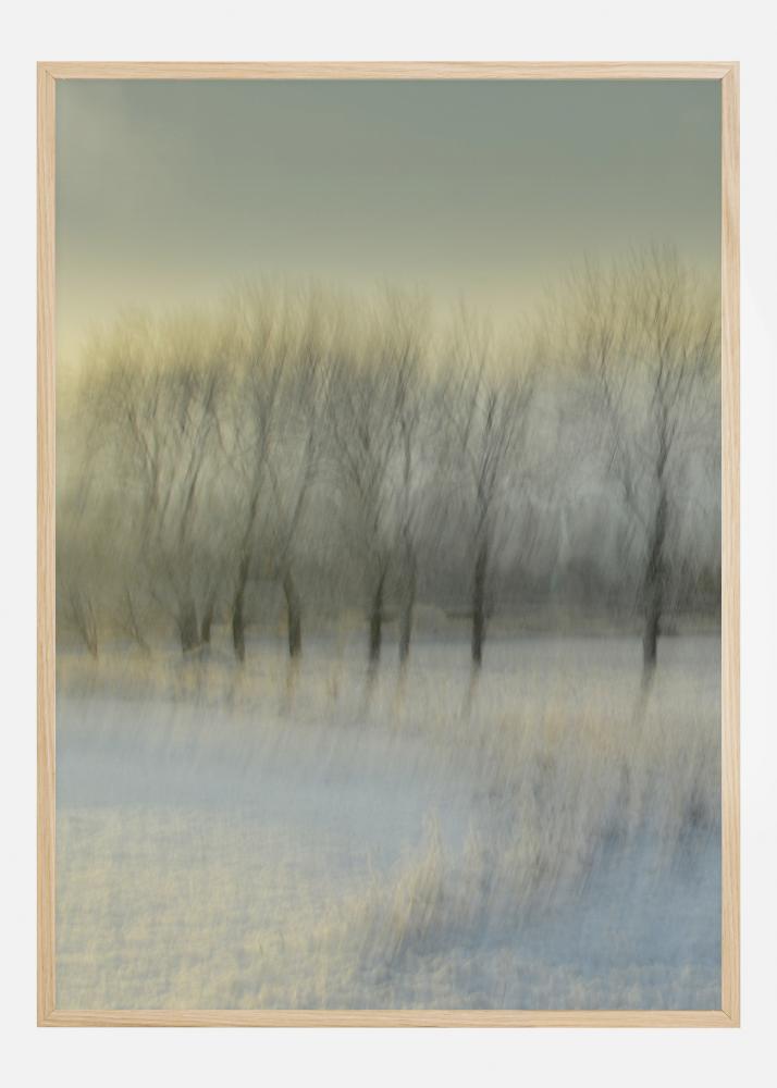 En fantastisk plakat i bevegelsesuskarphet med trær på en vinterbakgrunn. Hvit snø dekker alt i dette myke bildet ute av fokus. Trærne er uskarpe, og bare høye svarte trestammer er synlig, samt et bånd av mykt gul som flyter over tretoppene. Magien er i luften.