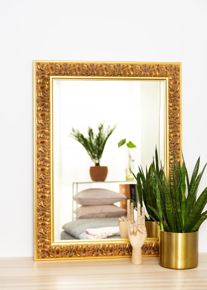 Gi hjemmet ditt en luksuriøs touch med dekorasjoner som fører tankene til barokken. Dette speilet er av høy kvalitet, og det har en fin, barokkmønstret ramme. Rammen er produsert av tre fra bærekraftig skogsbruk, og den er malt i forskjellige gullnyanser. Nærmest glasset løper en smal, lys gulllist. Ettersom speilet finnes i 7 forskjellige størrelser finner du like lett et speil til sminkebordet som et helfigurspeil.