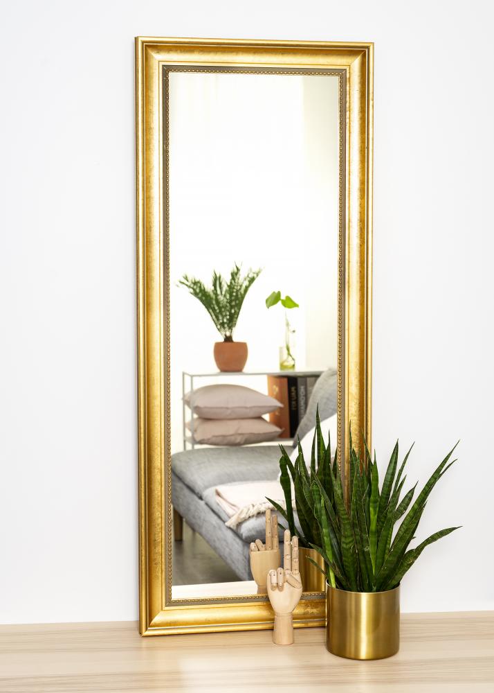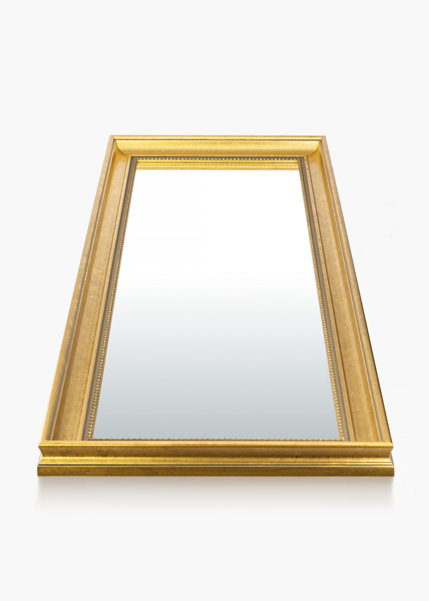 Skaff deg et pent speil og gjør interiøret i entréen, stua eller på badet ekstra luksuriøst. Dette stilfulle speilet finnes i flere forskjellige størrelser, så du finner enkelt et som passer akkurat ditt behov. Speilrammen har et klassisk design med en bred ramme og et diskret perlemønster nærmest glasset. Treet kommer fra bærekraftig skogsbruk, og det er malt i en vakker gullnyanse.