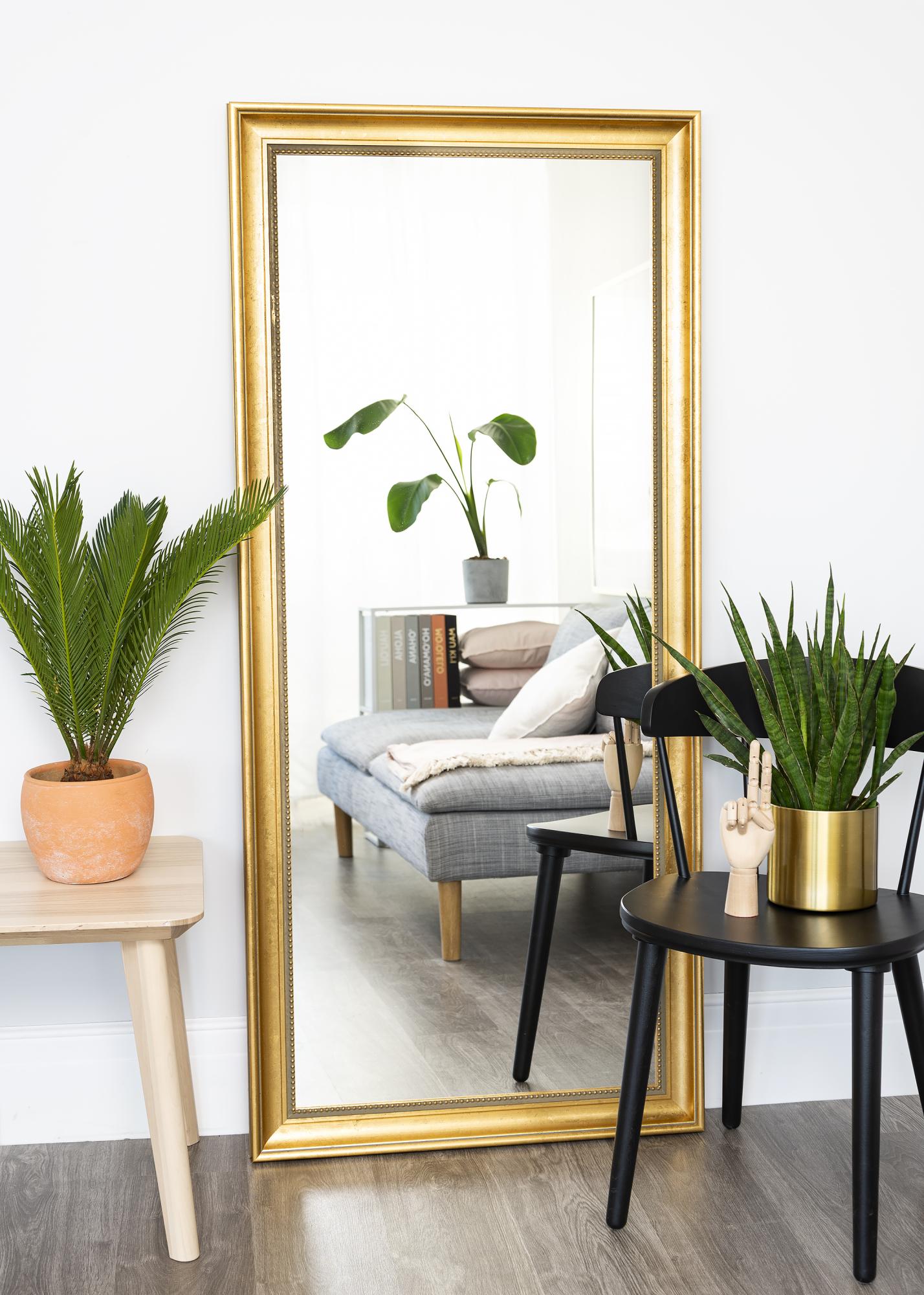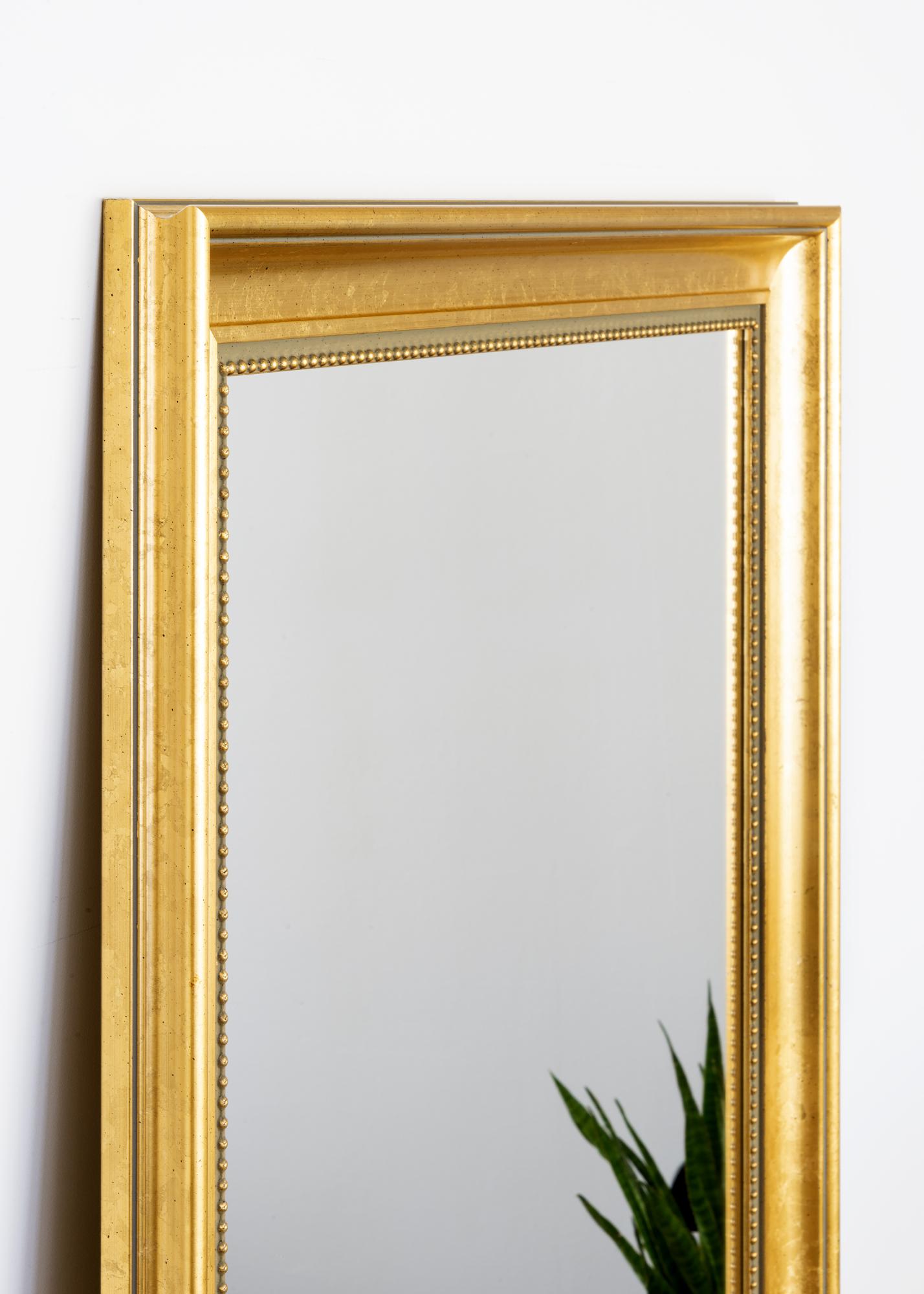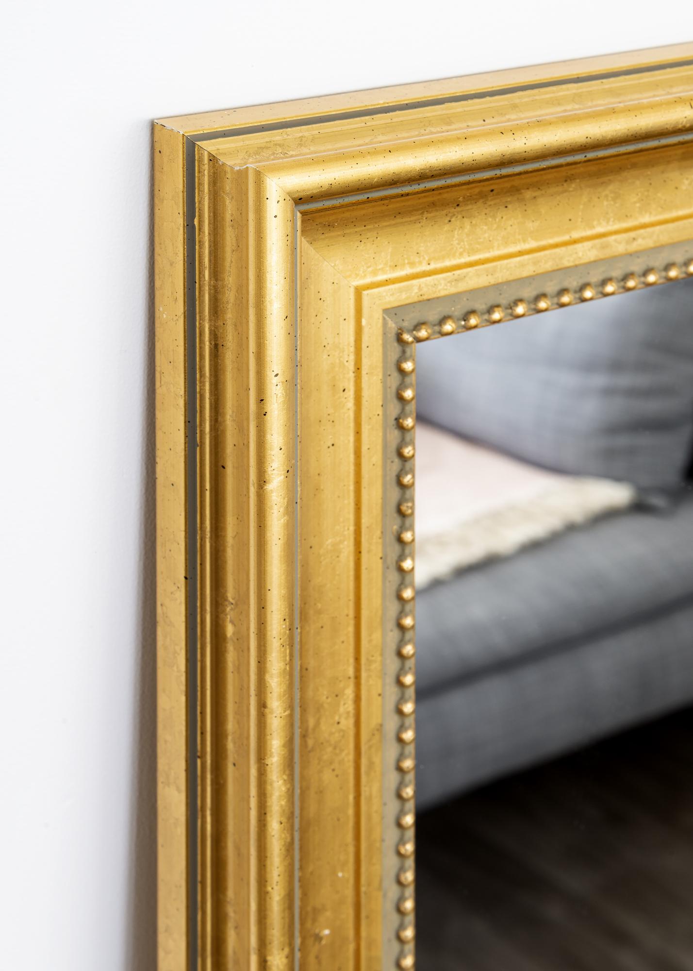 Skaff deg et pent speil og gjør interiøret i entréen, stua eller på badet ekstra luksuriøst. Dette stilfulle speilet finnes i flere forskjellige størrelser, så du finner enkelt et som passer akkurat ditt behov. Speilrammen har et klassisk design med en bred ramme og et diskret perlemønster nærmest glasset. Treet kommer fra bærekraftig skogsbruk, og det er malt i en vakker gullnyanse.