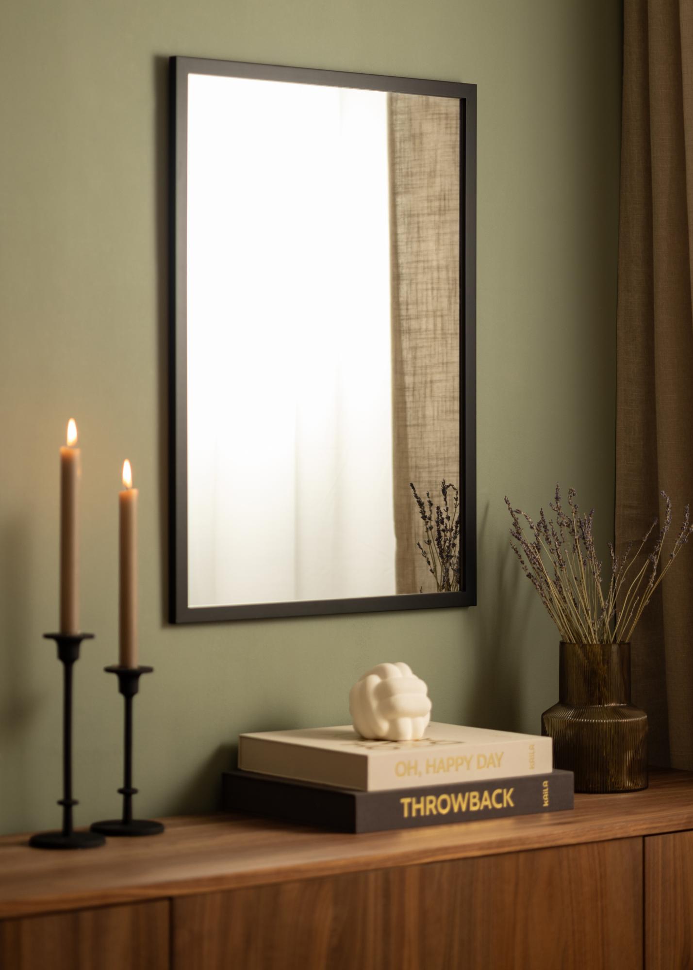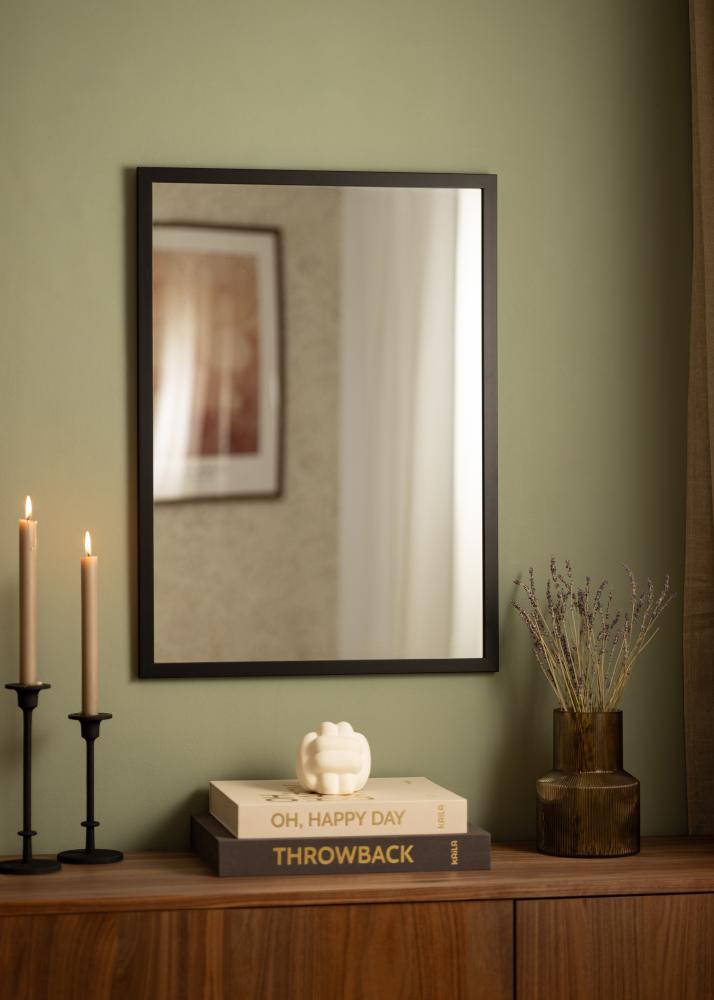 Black Wood er et utmerket valg for deg som leter etter et stilrent veggspeil med en enkel svart ramme. Speilet er laget av malt ayoustre og utstyrt med ufarget speilglass. Den 22 mm brede rammen har en tradisjonell firkantet profil som lar speilflaten stå i fokus.