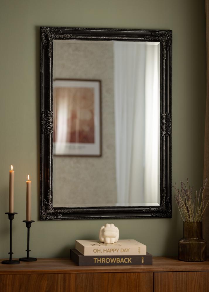 Speilserien Bologna Svart har latinsk utforming med rikelig dekor i hjørner og på rammesidens midtpunkter. Noe smalere ramme enn mange andre speil i denne stilen. Rammen er laget av tre, og dekoren er støpt i gips før den ble satt på rammen.