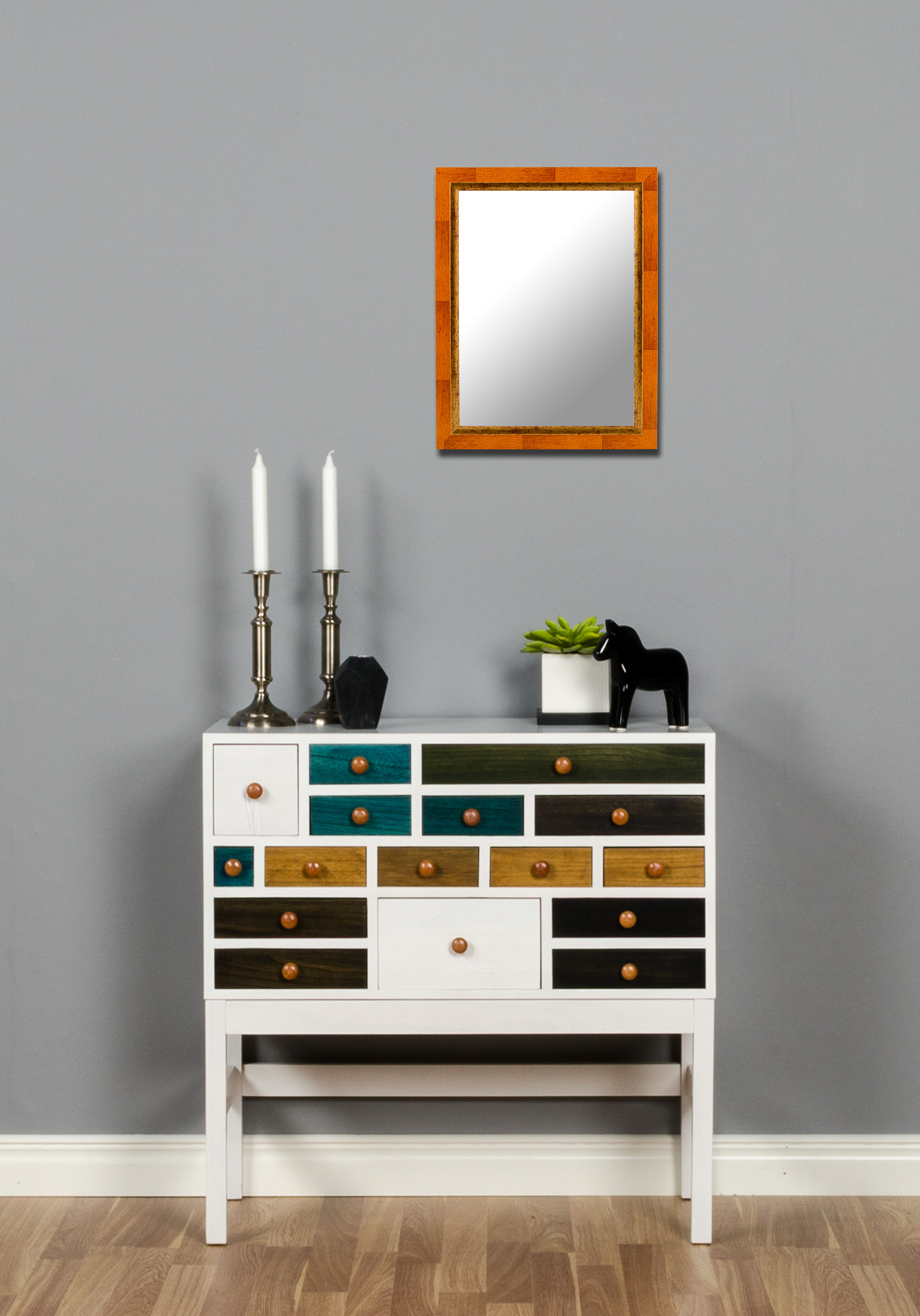 Noen av de mest elegante speilene er designet i Färila! Her har vi et fint eksemplar som vi lager etter dine mål i vårt eget rammeverksted. Speilet har en rett treramme med slitte detaljer som tilfører karakter. I det bredeste partiet kan du skimte et diskret symmetrisk mønster.