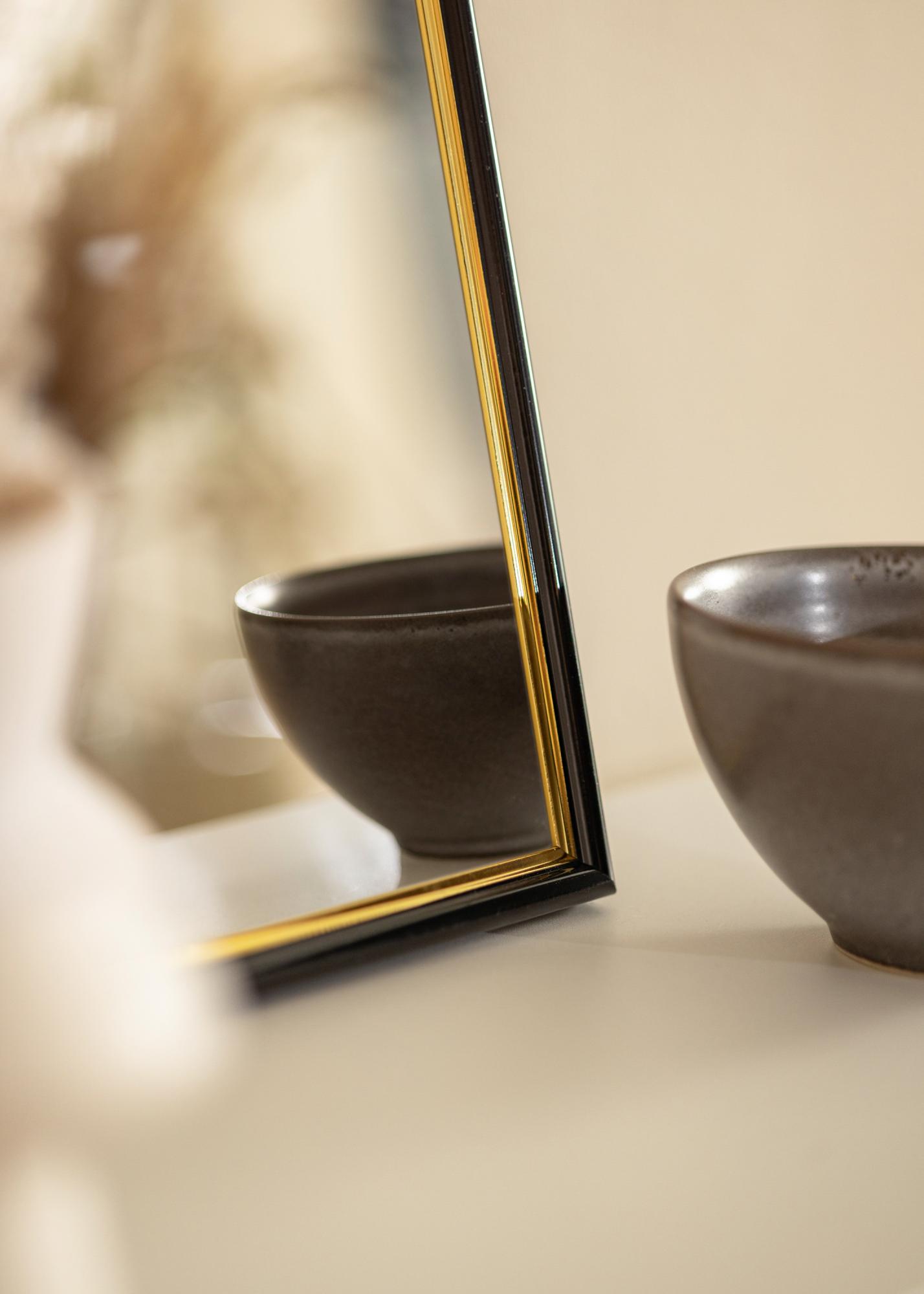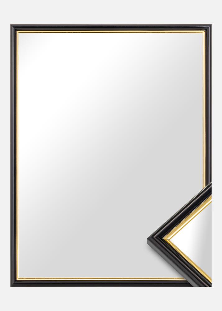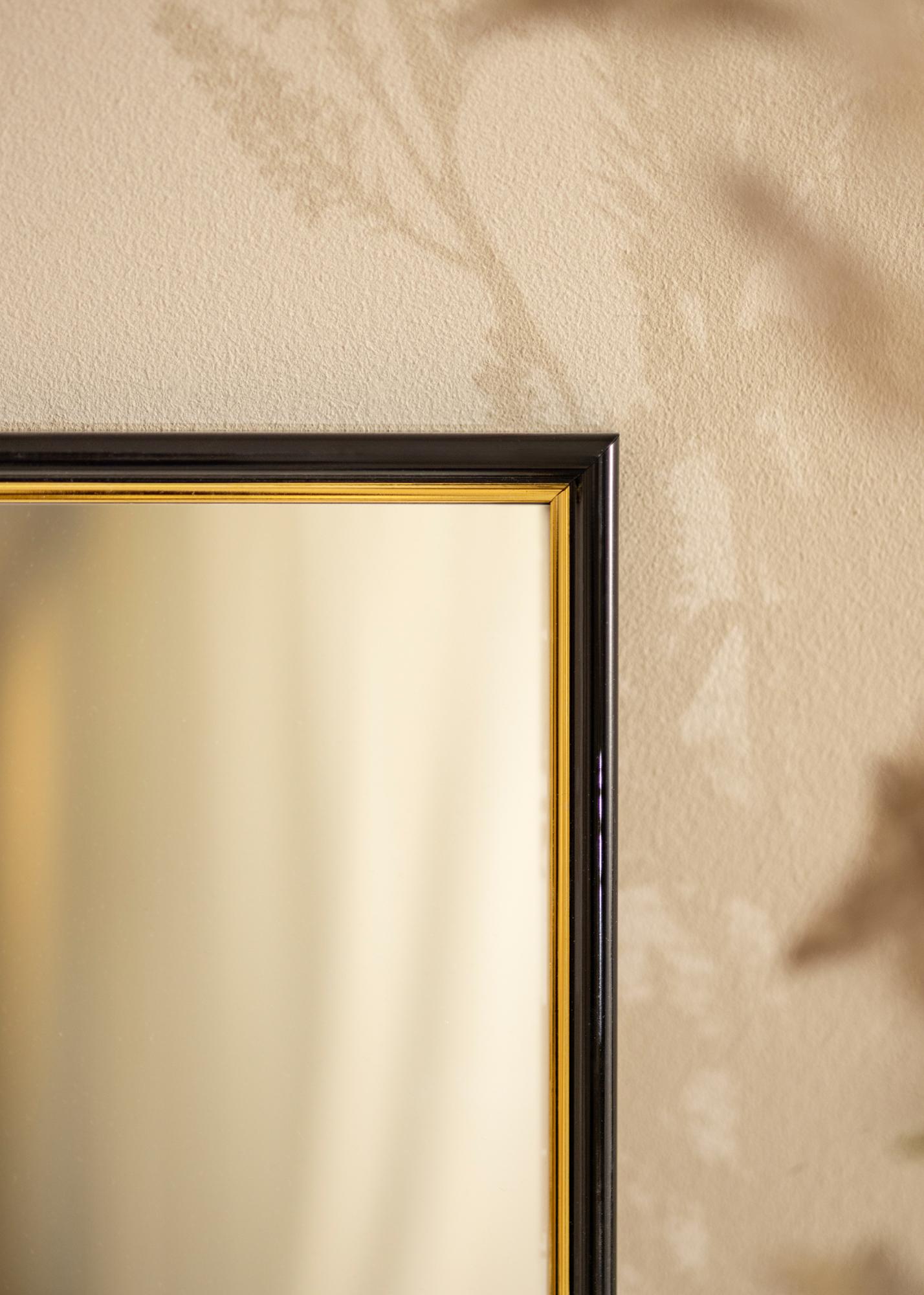 Skift atmosfæren i gangen, baderommet eller hverdagsrommet når du henger opp dette luksuriøse speilet! Speilet er svart med et gullfarget parti nærmest glasset. Fargene passer fint sammen med innredningsdetaljer i for eksempel svart, gull, lilla eller pastell. Siden det lages etter dine ønskemål kan du være sikker på at det passer perfekt der du vil ha det.