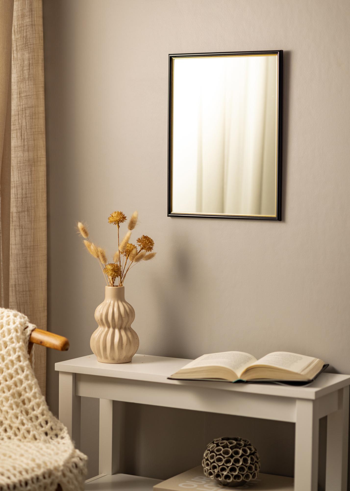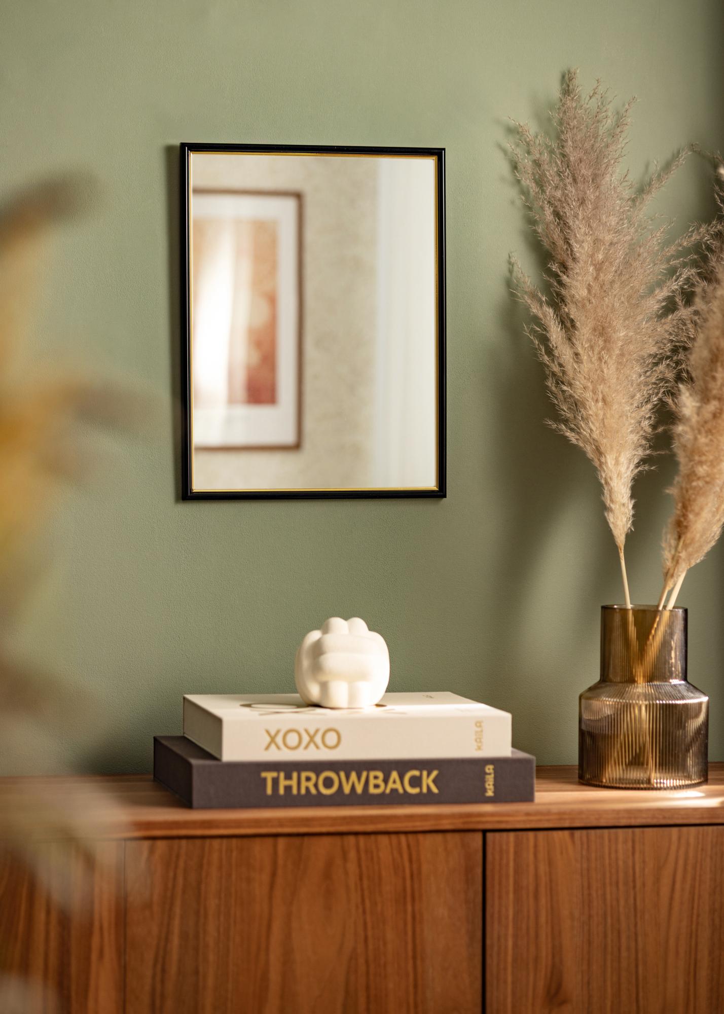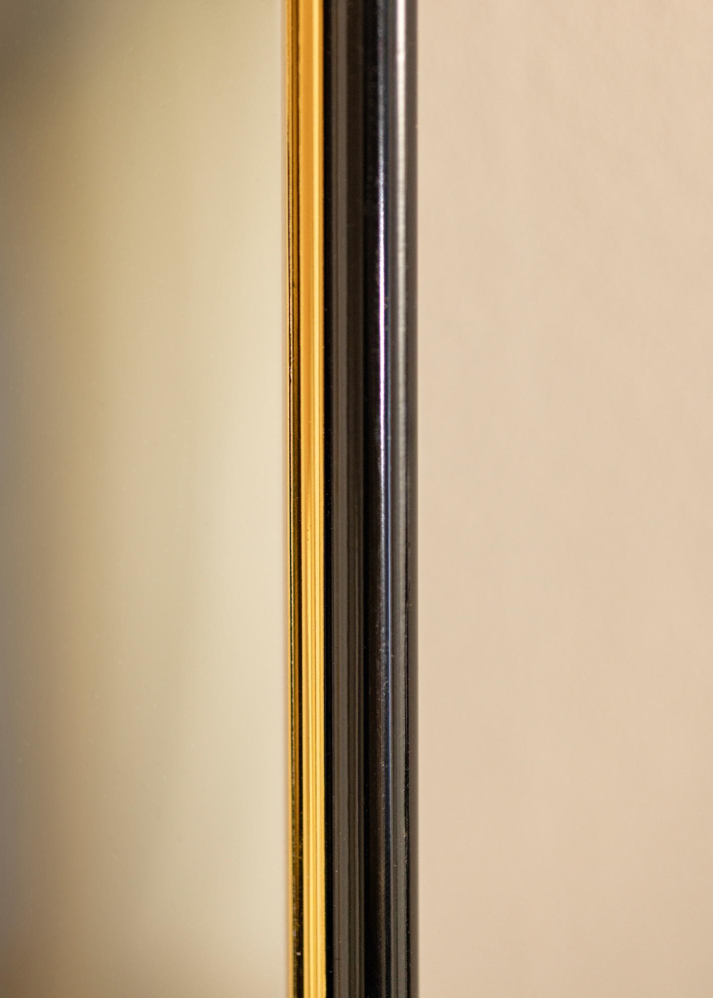 Skift atmosfæren i gangen, baderommet eller hverdagsrommet når du henger opp dette luksuriøse speilet! Speilet er svart med et gullfarget parti nærmest glasset. Fargene passer fint sammen med innredningsdetaljer i for eksempel svart, gull, lilla eller pastell. Siden det lages etter dine ønskemål kan du være sikker på at det passer perfekt der du vil ha det.