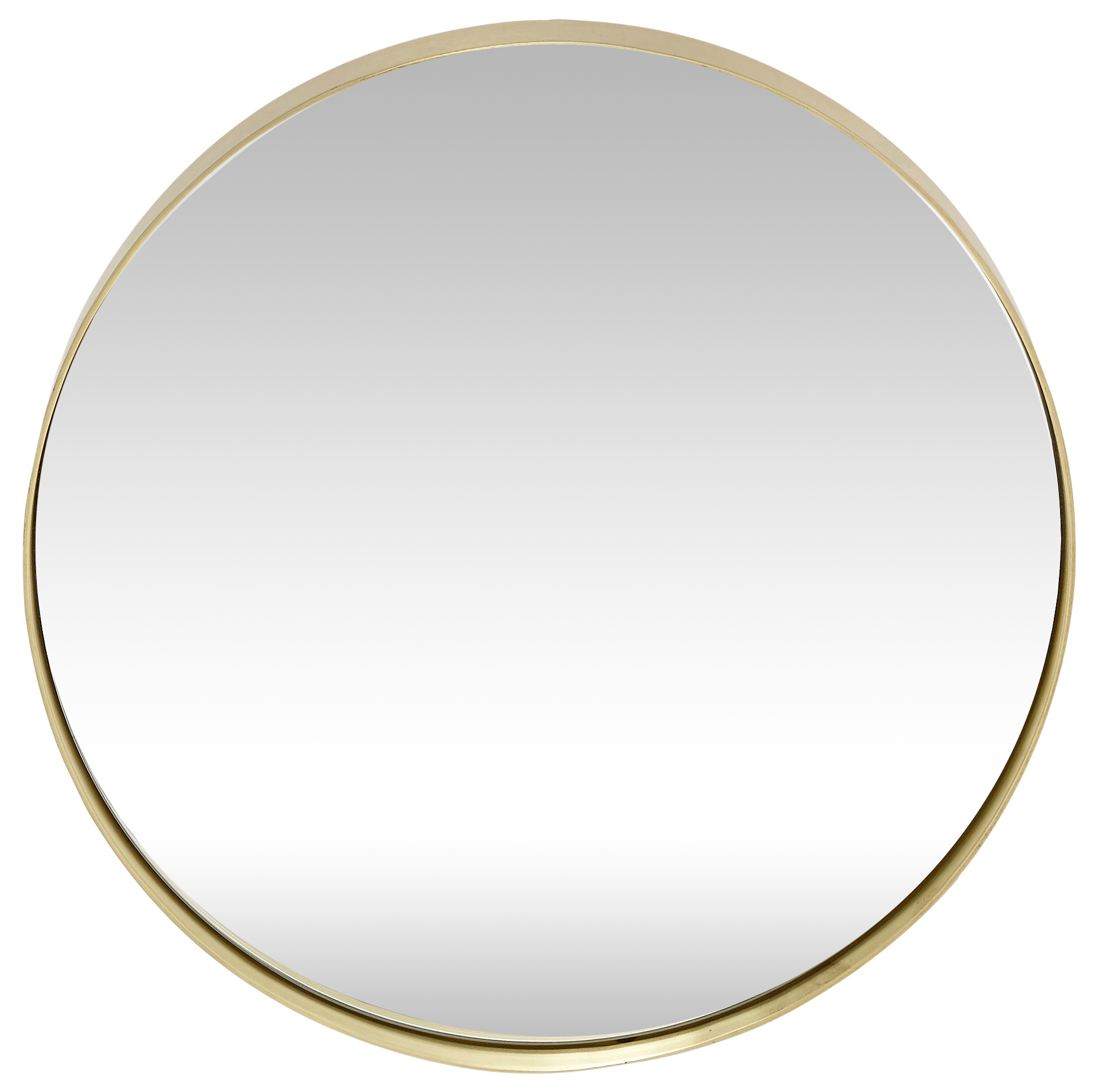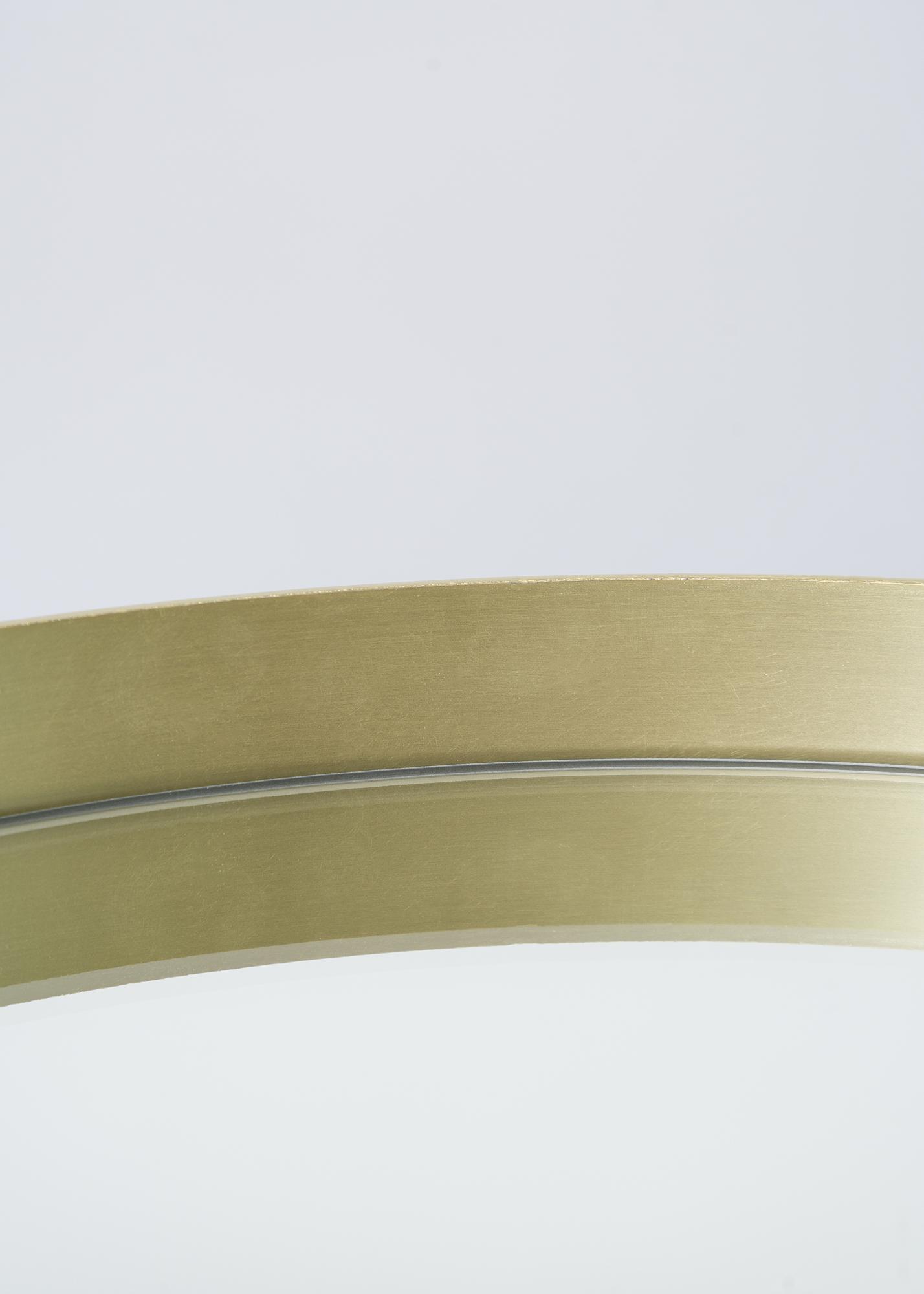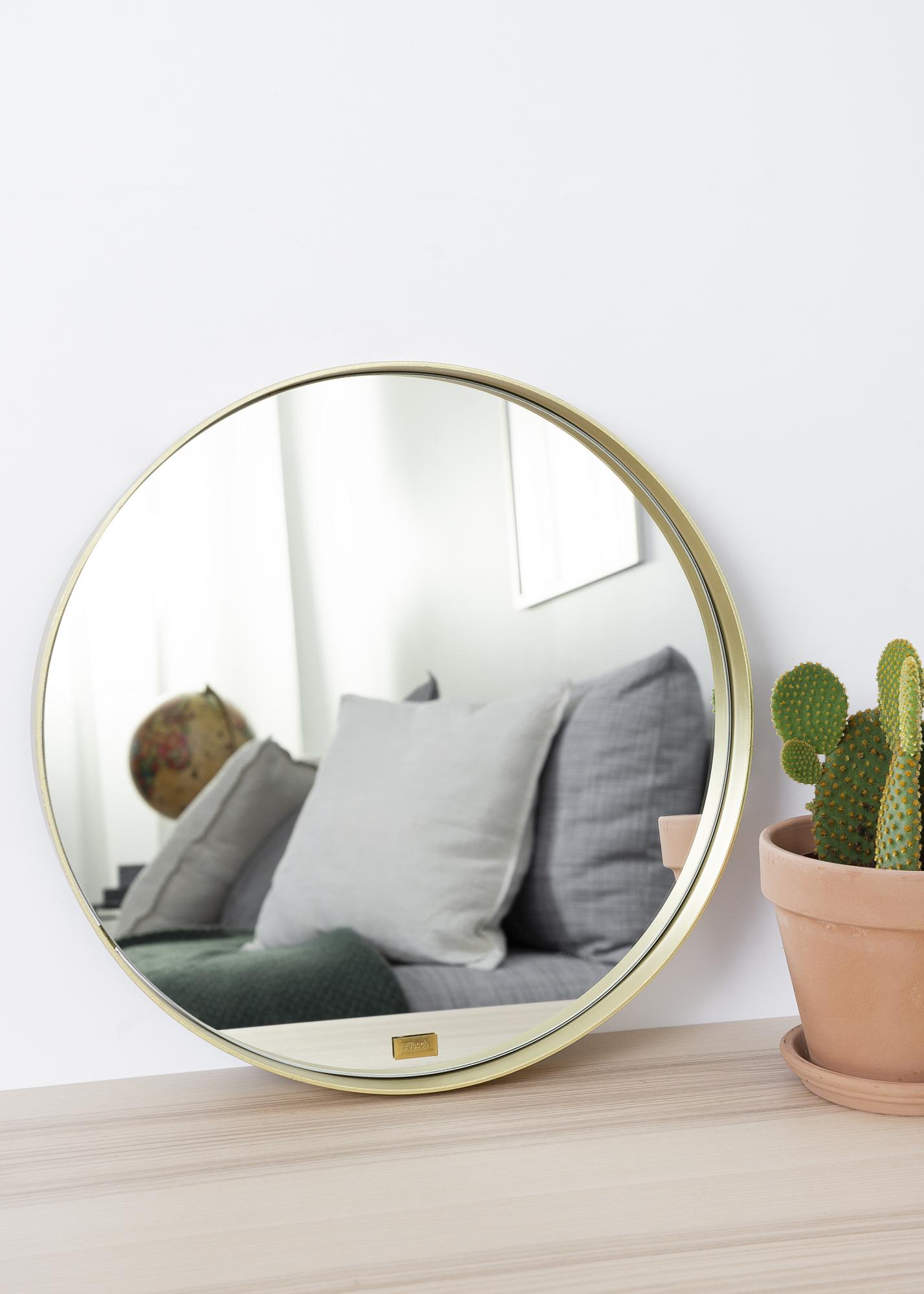 Et rundt veggspeil med en innbydende og eksklusiv følelse. Speilet omkranses av en messingfarget metallramme. Rammen er tynn og stilren, samtidig som den har en kant på noen centimeter som gir en smakfull effekt til speilets helhet.