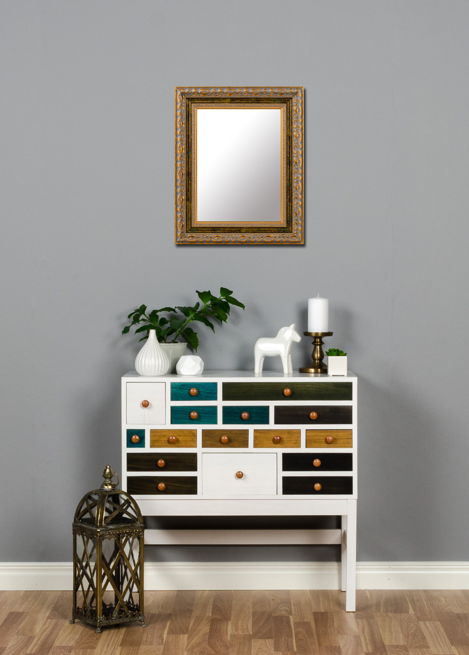 Med hjelp av det rette speilet kan du løfte en hel vegg! Dette luksuriøse gullspeilet har et spennende design som tiltrekker seg oppmerksomhet. Foran har trerammen både et stort og et lite bånd med snirkelmønster som brytes med et slitt parti. Overflaten er behandlet for at det skal se karakteristisk eldet ut. Ettersom den lages etter dine mål kan du være sikker på at den passer akkurat der du vil ha den!