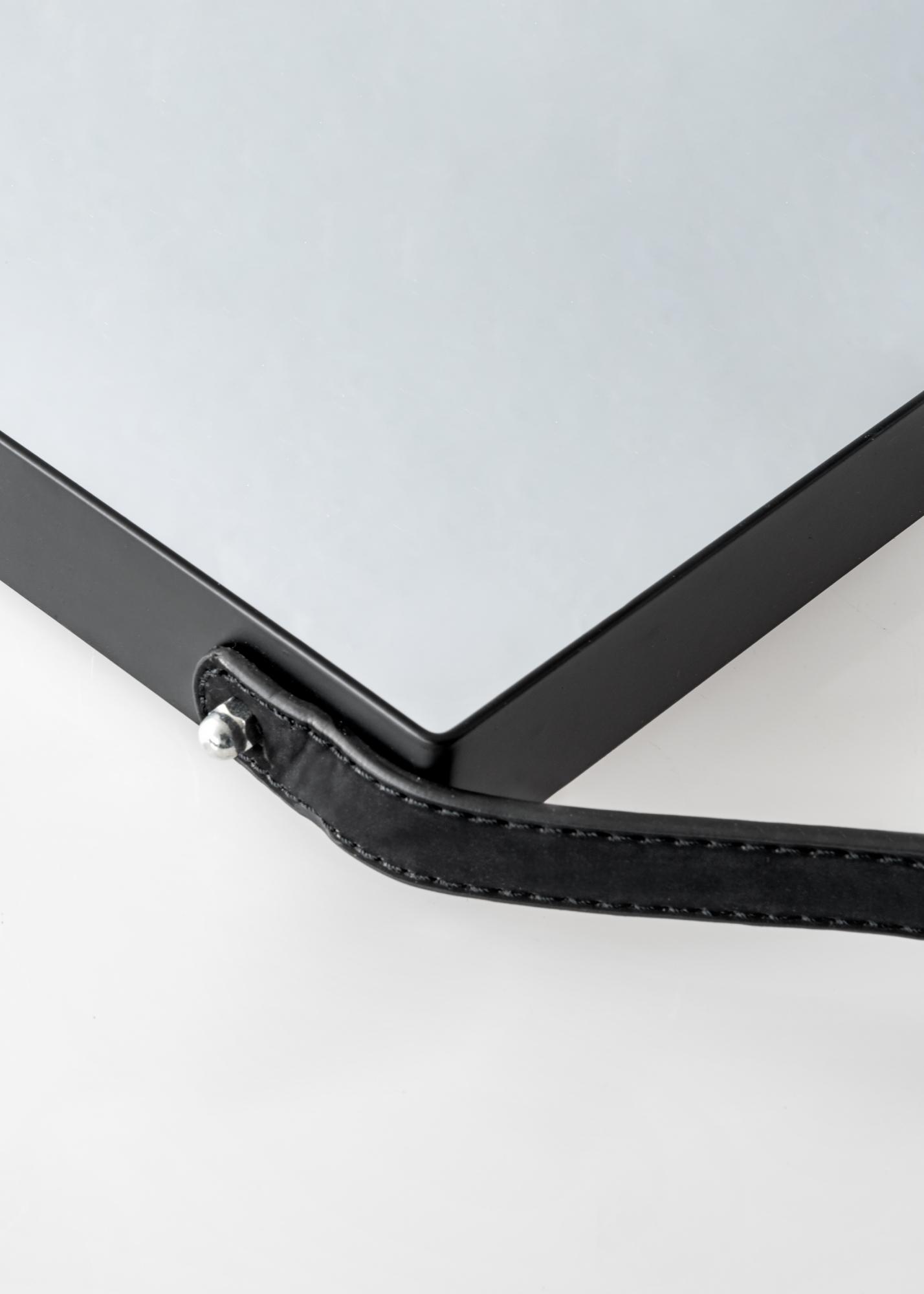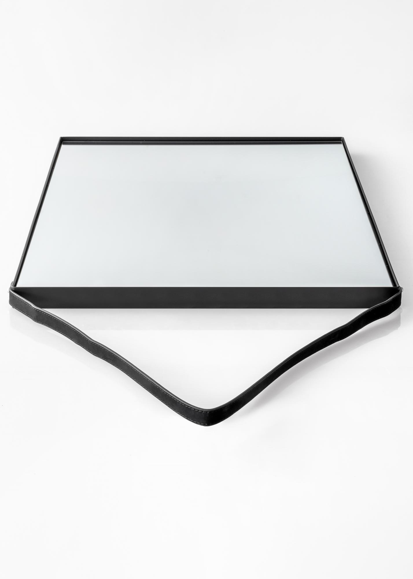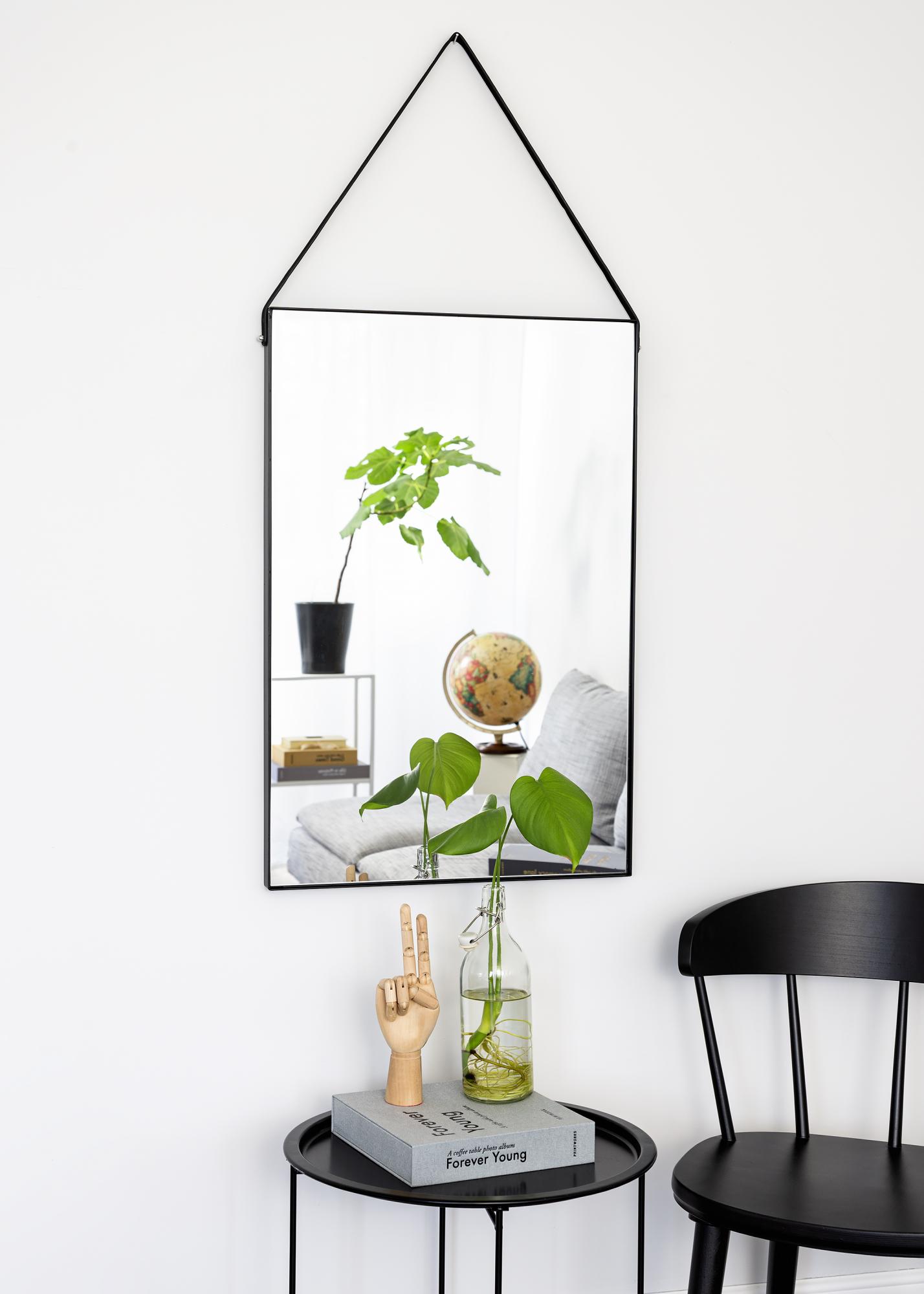 Dette rektangulære speilet har et stilig og moderne design. Rundt speilet sitter det en tynn ramme i svartfarget metall, som gir speilet et stilrent uttrykk. På toppen av speilet henger et dekorativt og praktisk bånd, som gjør det enkelt å henge speilet på veggen.