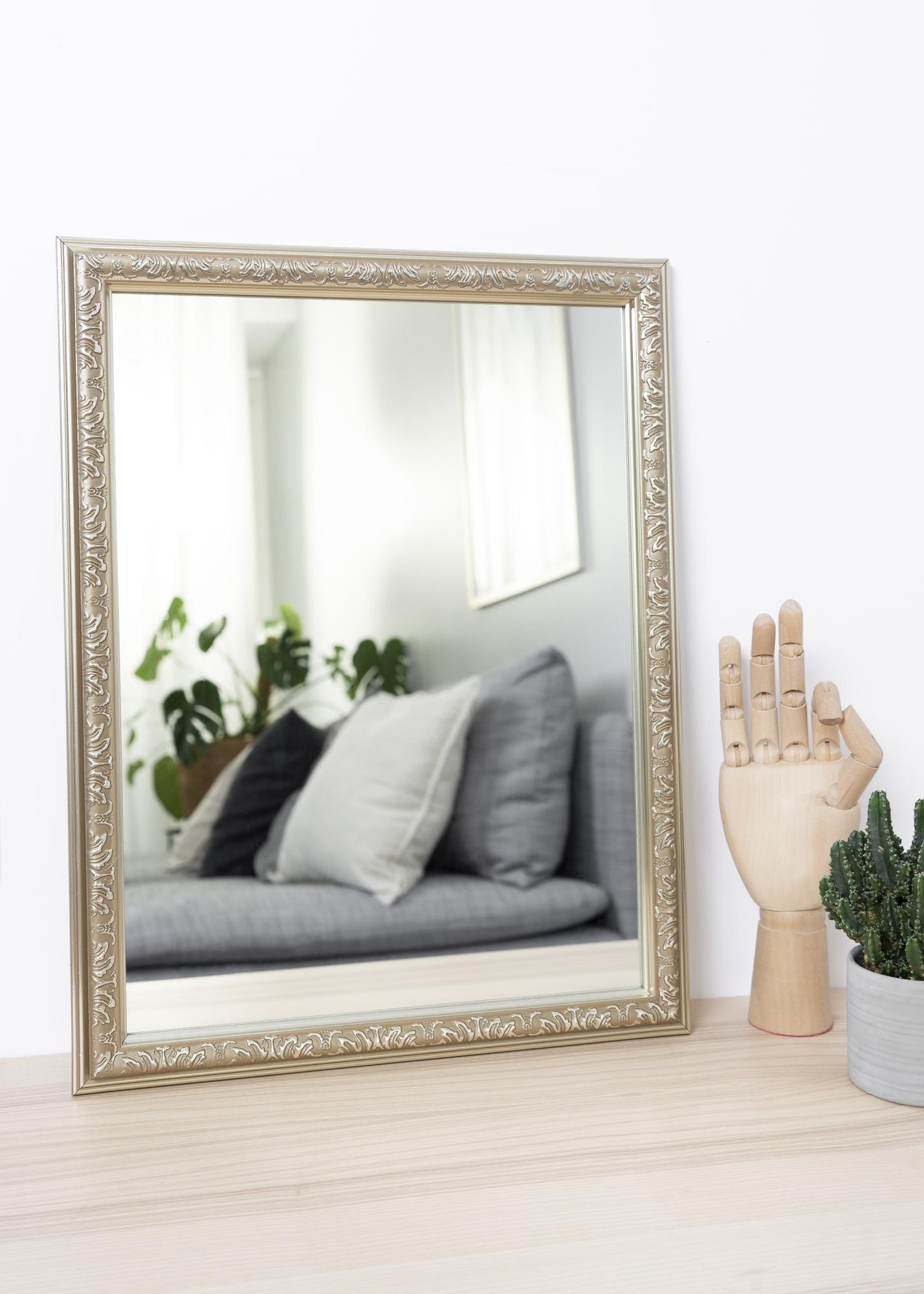 Start rammevelgeren »Nost Sølv er en serie veggspeil. Rammen er rikt dekorert med tilfeldige symboler som gir et litt mystisk inntrykk. Rammen er laget av tre og dekorasjonene er laget av gips.