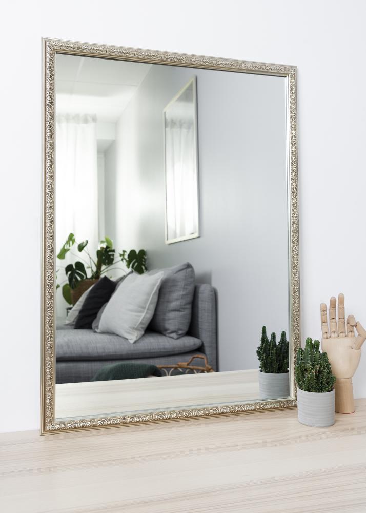 Start rammevelgeren »Nost Sølv er en serie veggspeil. Rammen er rikelig dekorert med symboler som gir et litt mystisk inntrykk. Rammen er laget av tre og dekorasjonene er støpt i gips.