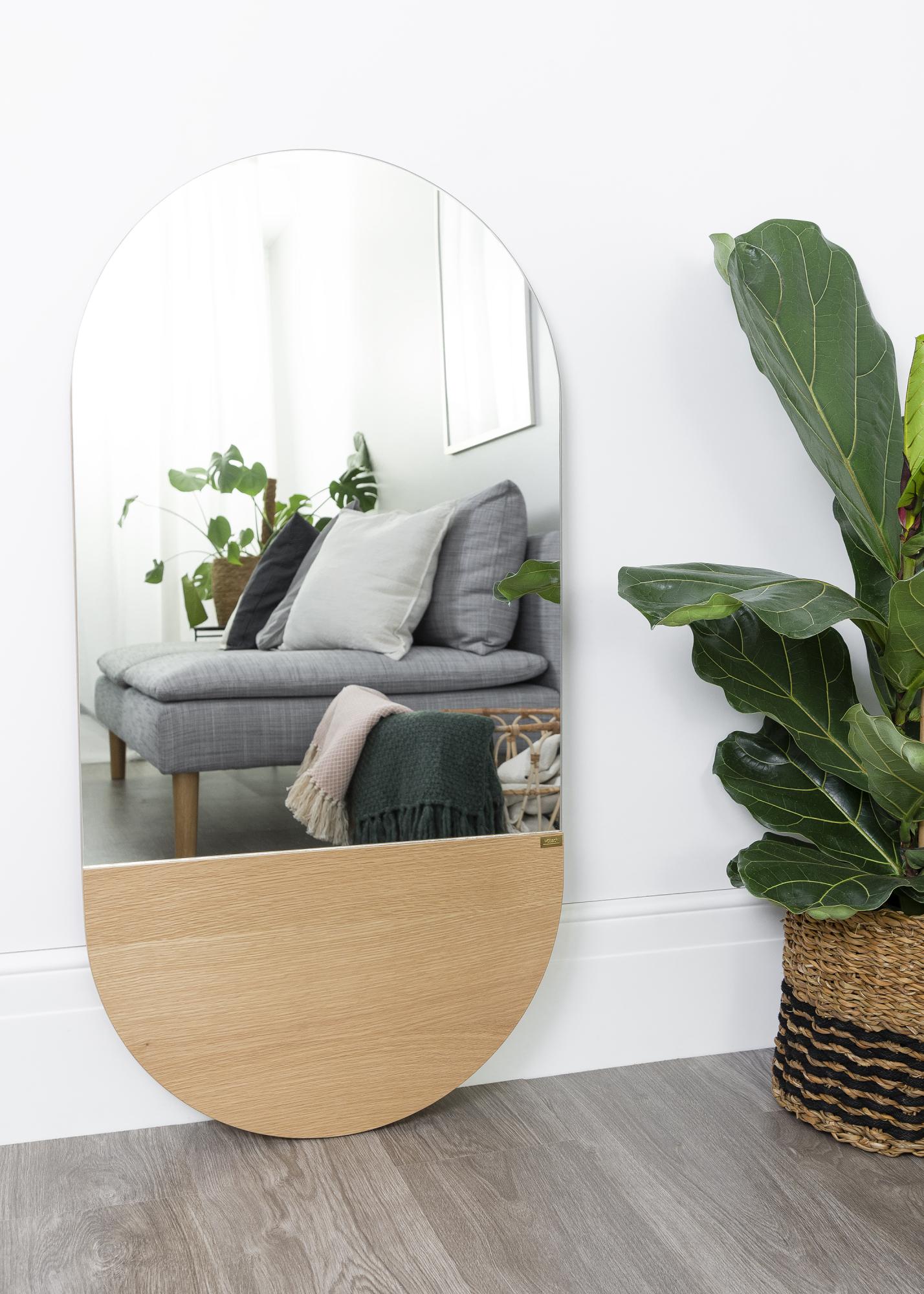 Dette ovale veggspeilet fra danske Hübsch er beviset på at enkelt og stilrent design likevel kan gi en slående effekt. Speilets bakside og nedre del av speilet forside er erstattet med eik, som gir det en naturnær og varm fremtoning.