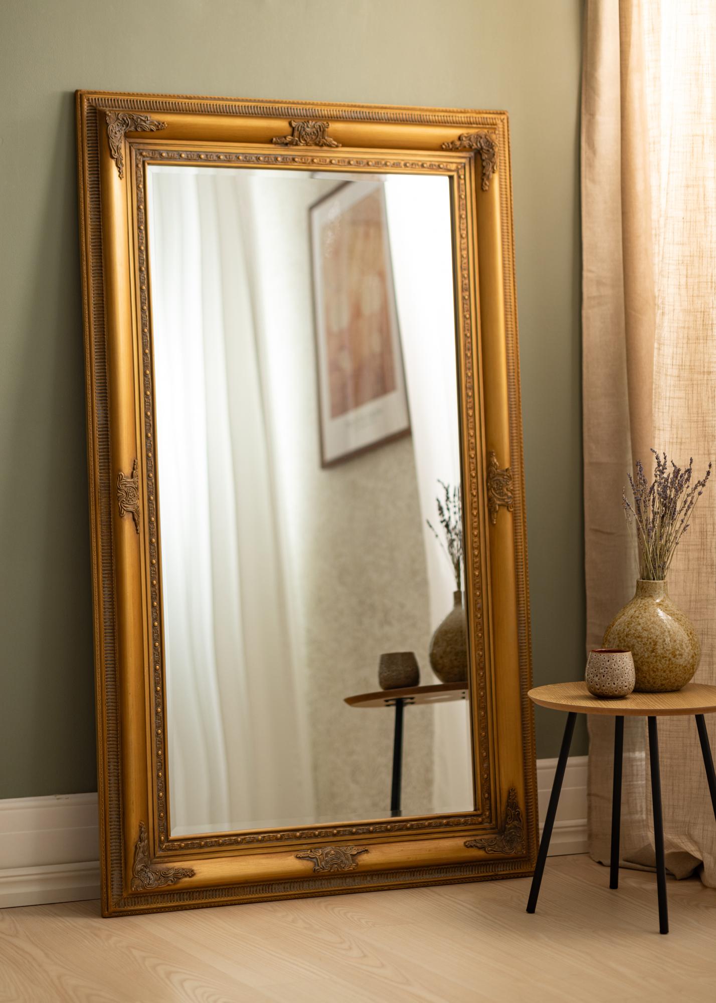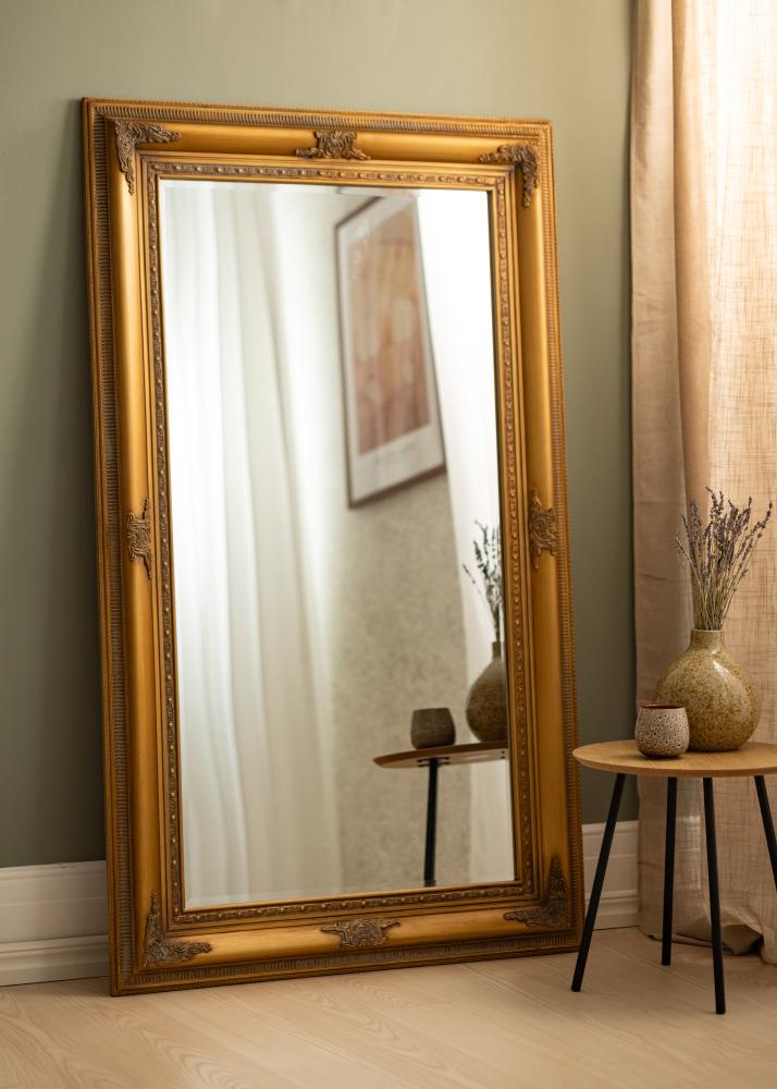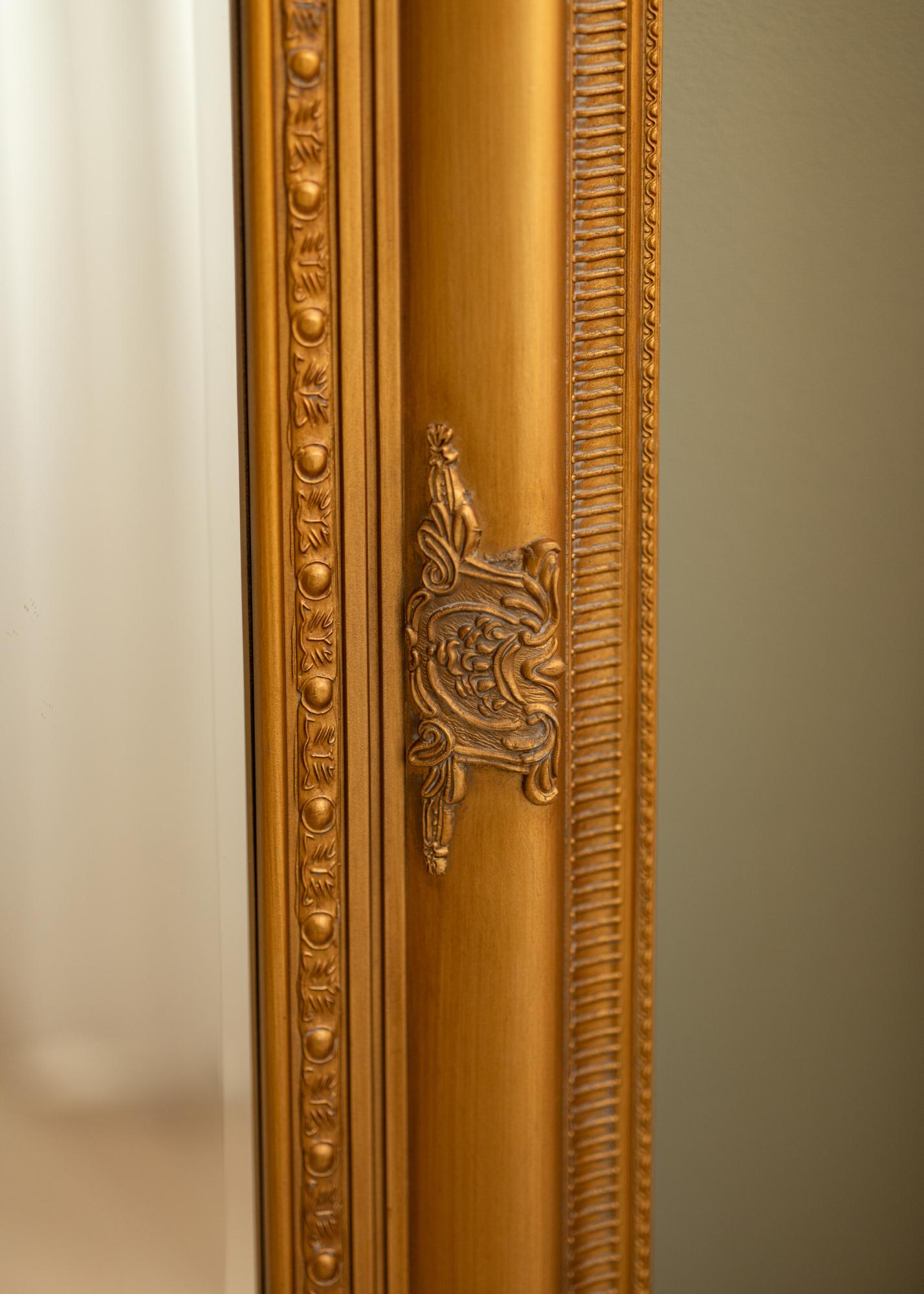 Speil med fin profil i gullfarge, med en antikk stil og dekorert med blomsterdetaljer. Den klassiske stilen på speilrammen gjør at den passer inn i innredningsstiler med eldre møbler, men det kan også brukes for å lage en spennende kontrast til en stilren samtidsinnredning. Speilet er fint å henge opp i gangen, på soverommet eller i en garderobe, og fremheves på en fin måte sammen med innredningstilbehør i messing eller gullnyanser.