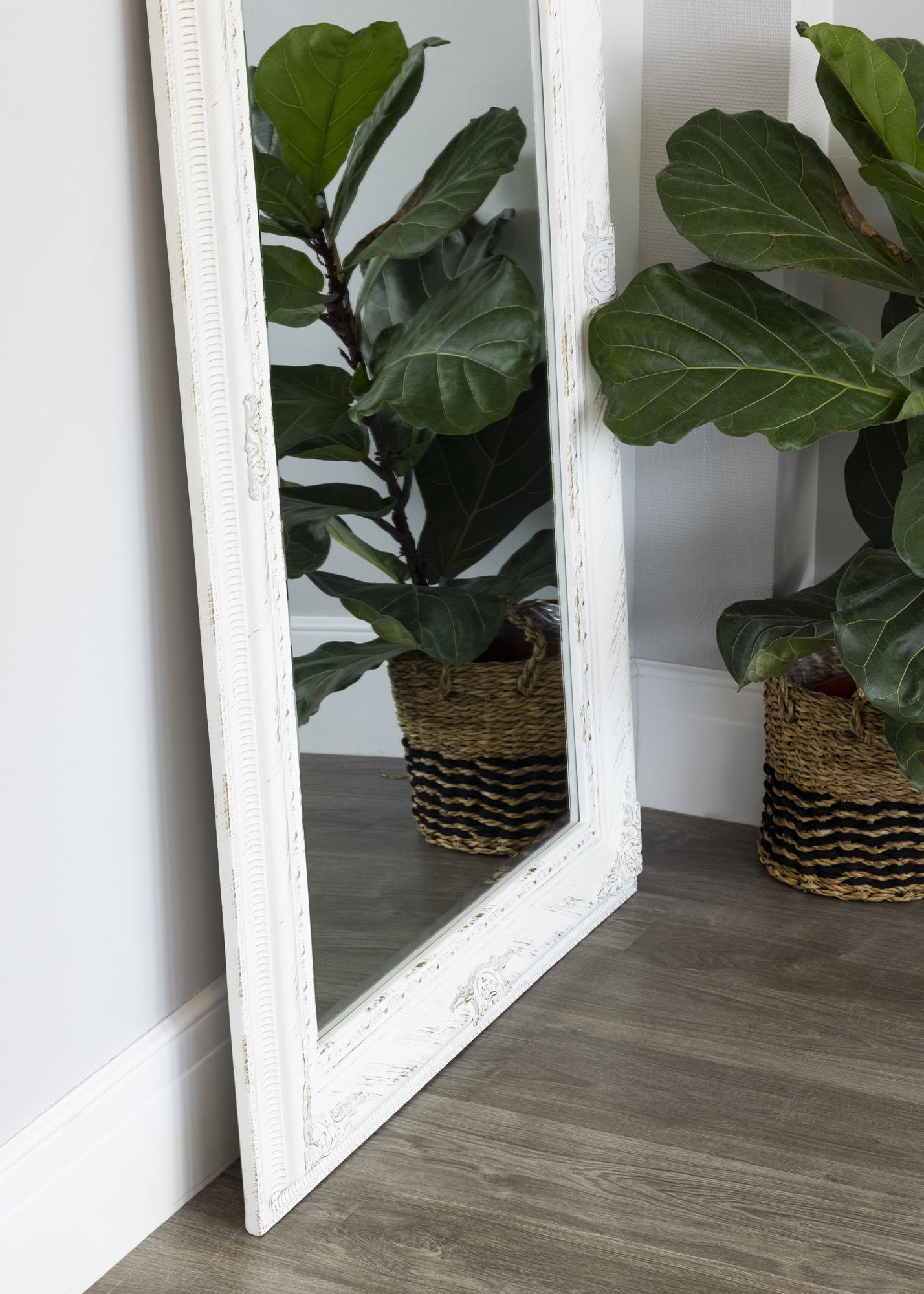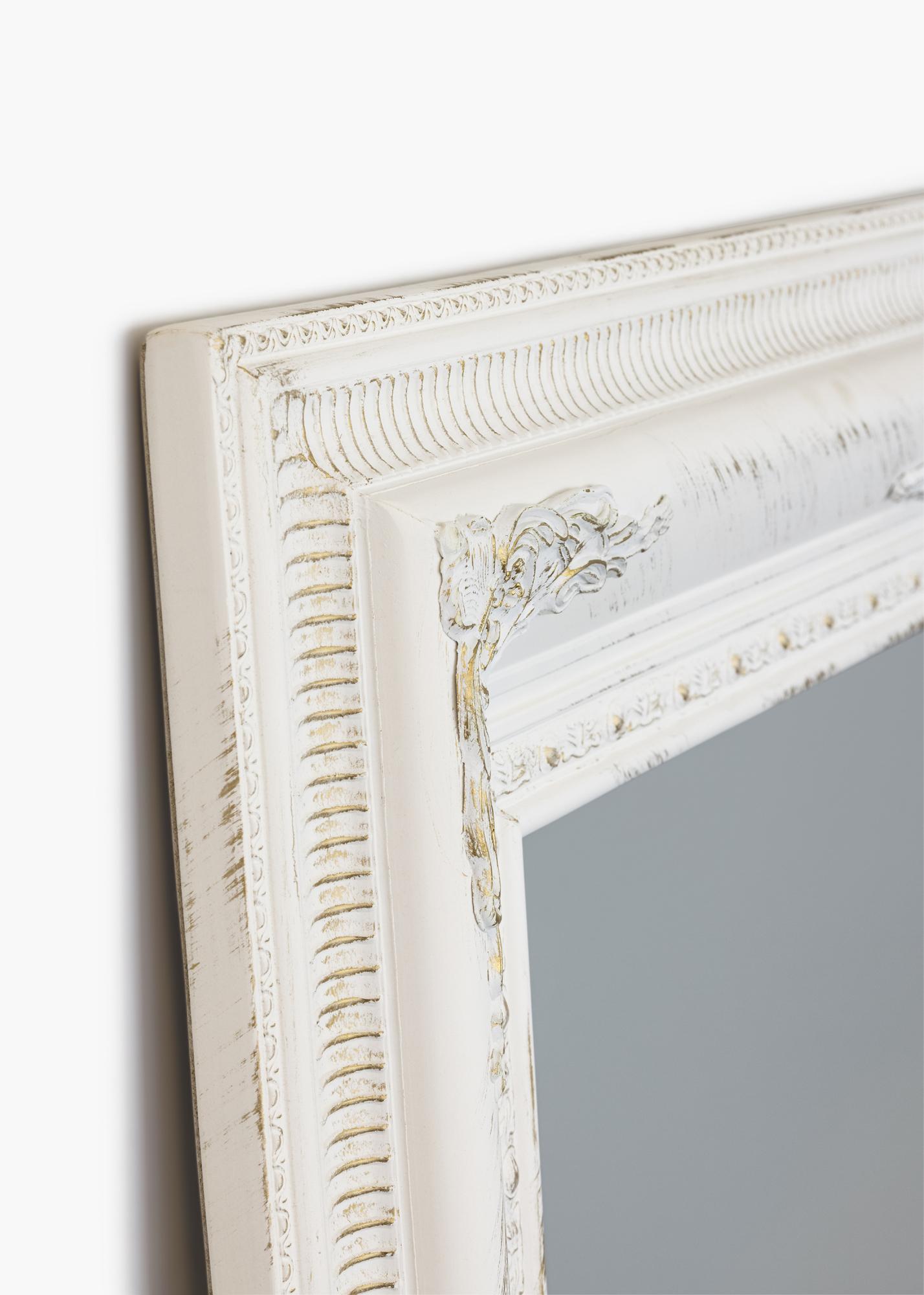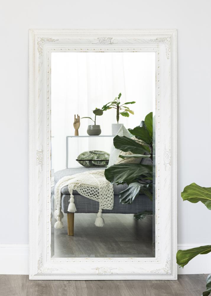 Hvitt speil med en romantisk følelse – perfekt for noen som vil lage en innredningsstil preget av roser, glamour og svunne tider. Speilet er fint å henge opp både på baderommet, ovenfor et stort møbel og i resten av hjemmet. Størrelsen gjør at den passer til å plasseres på veggen ovenfor en skikkelig skjenk eller sofa. Speilet kan også brukes som en del av en bildevegg med bilder innrammet i hvite rammer i lignende stil, og den hjelper til med å lyse opp et mørkt rom.
