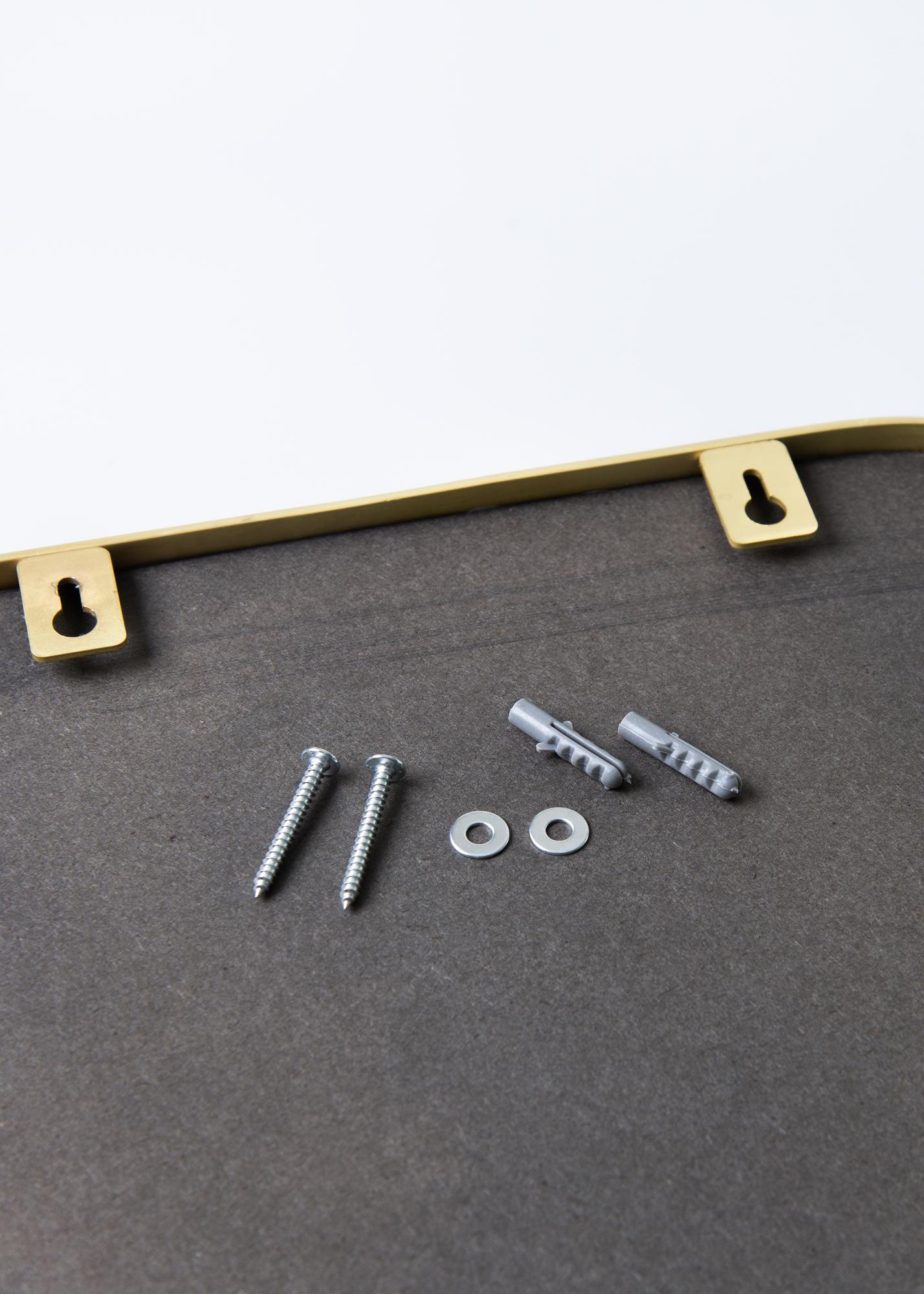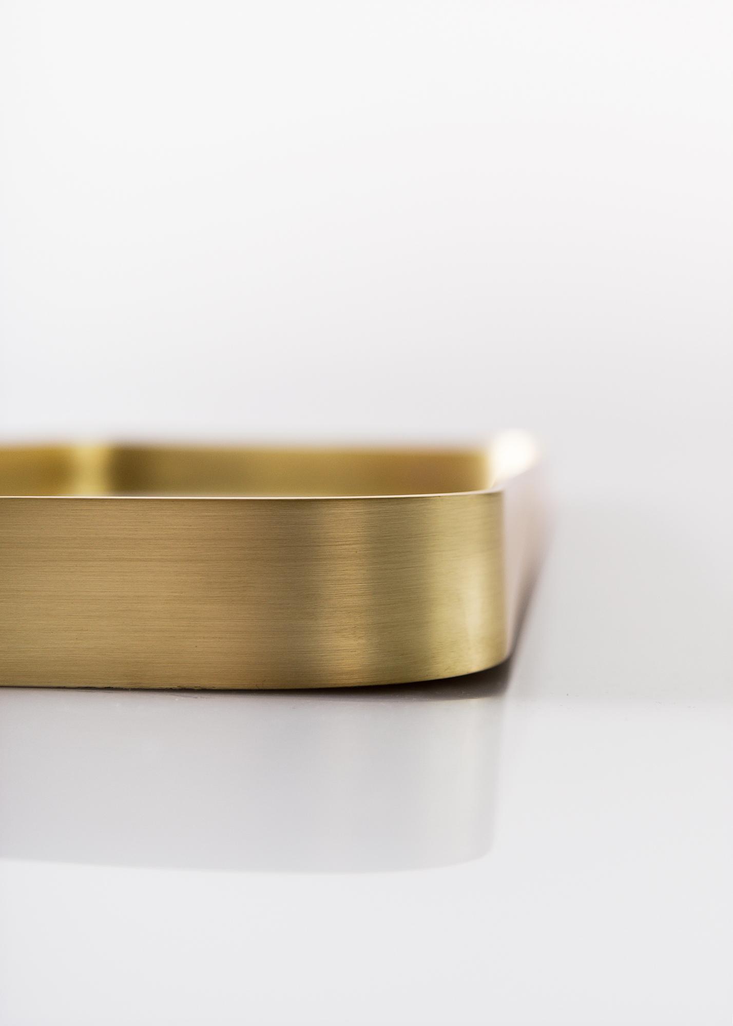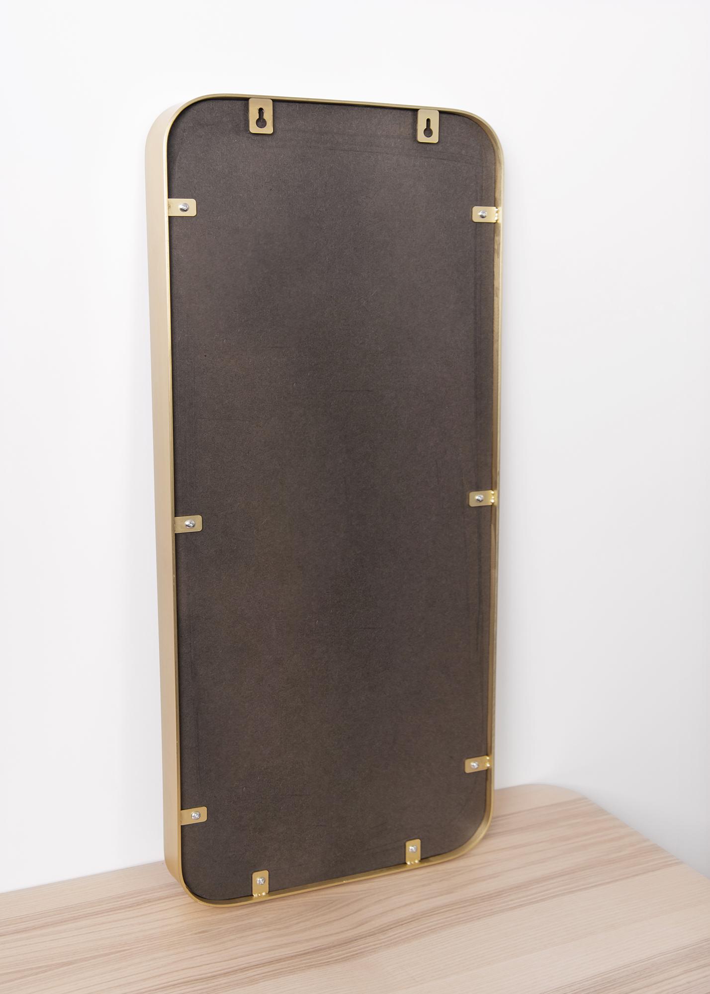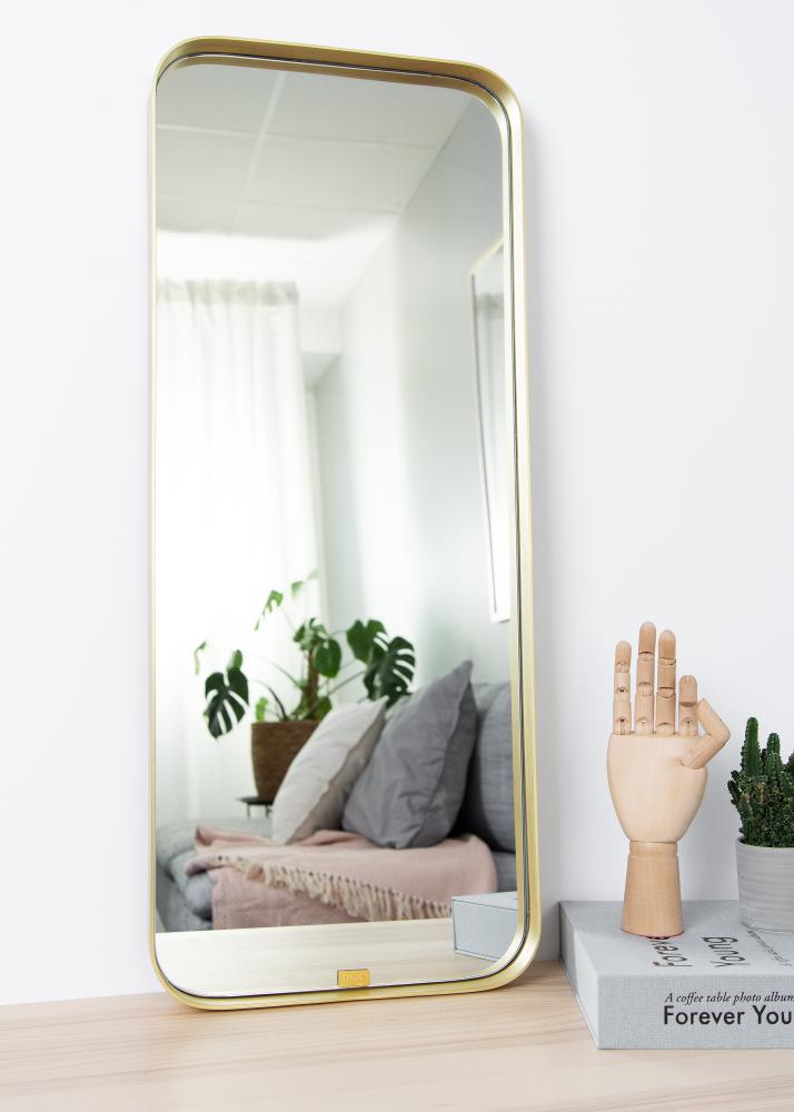 Et rektangulært speil i stilrent dansk design. Rammen har avrundede hjørner og er laget i metall med messingfinish, som gir et elegant og mykt inntrykk.