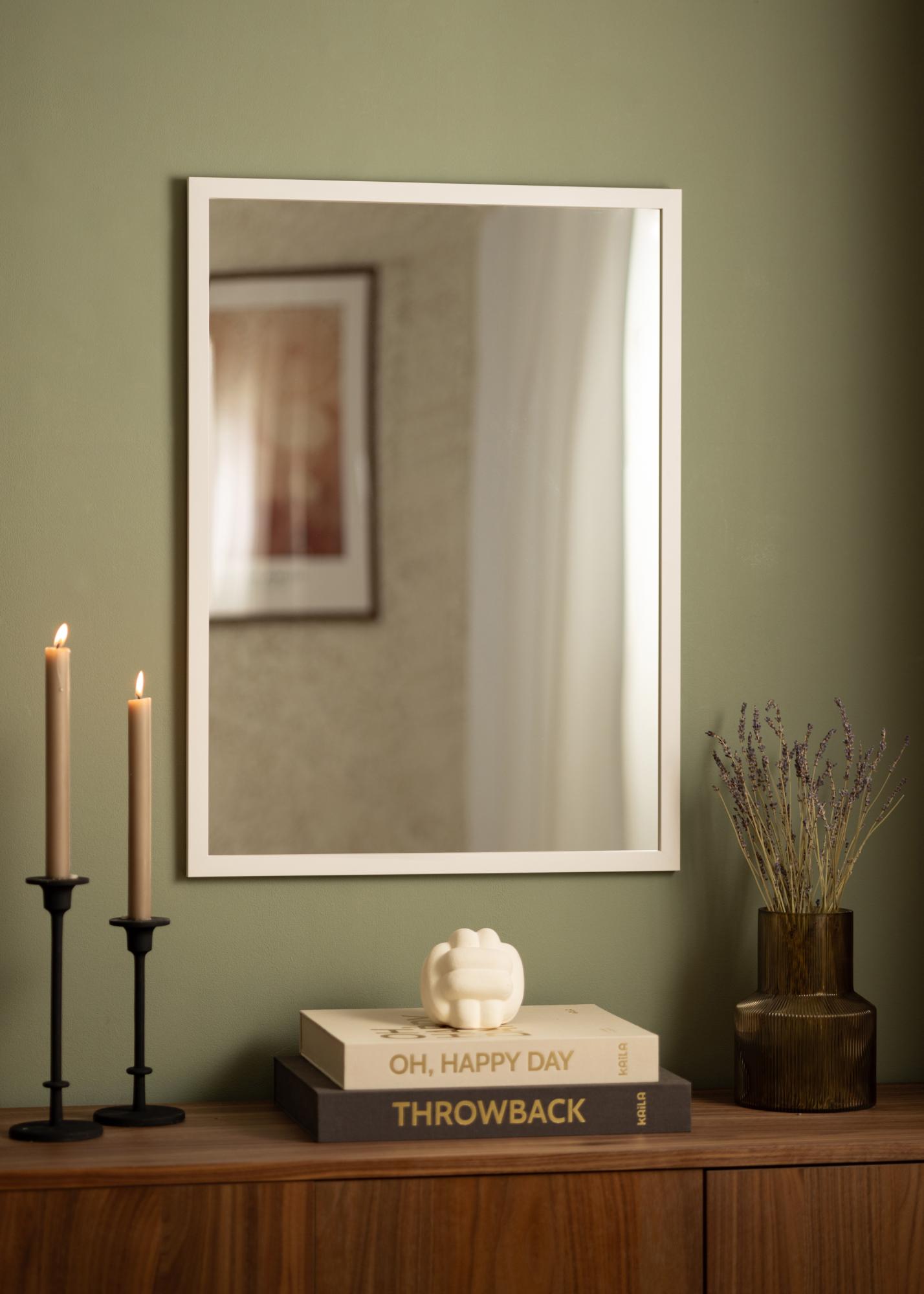 Dette speilet har et klassisk utseende med en 22 mm bred og 15 mm dyp ramme i hvitmalt tre. Det tradisjonelle uttrykket forsterkes av speilets ufargede speilglass.