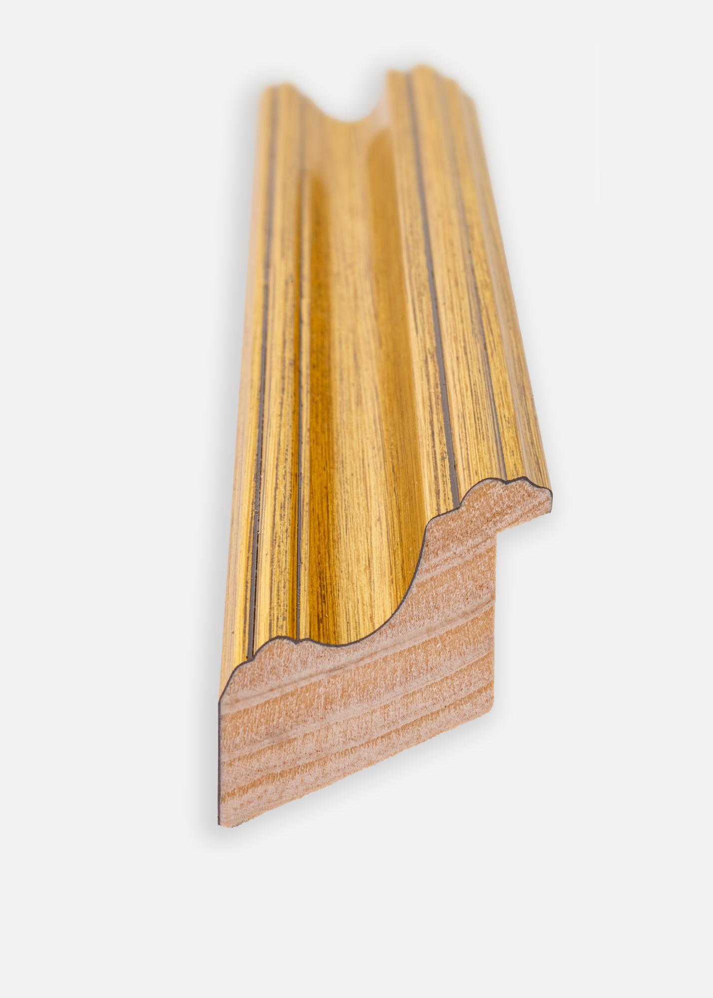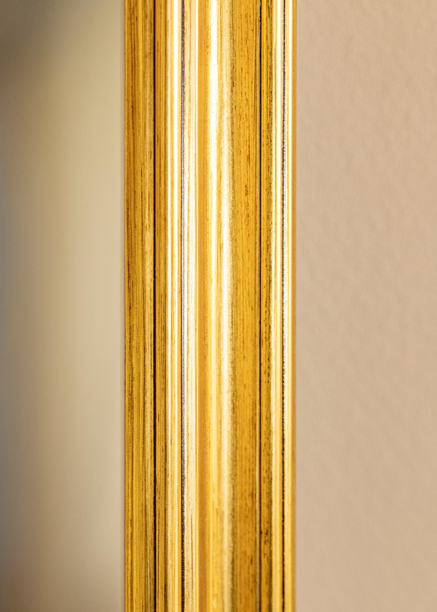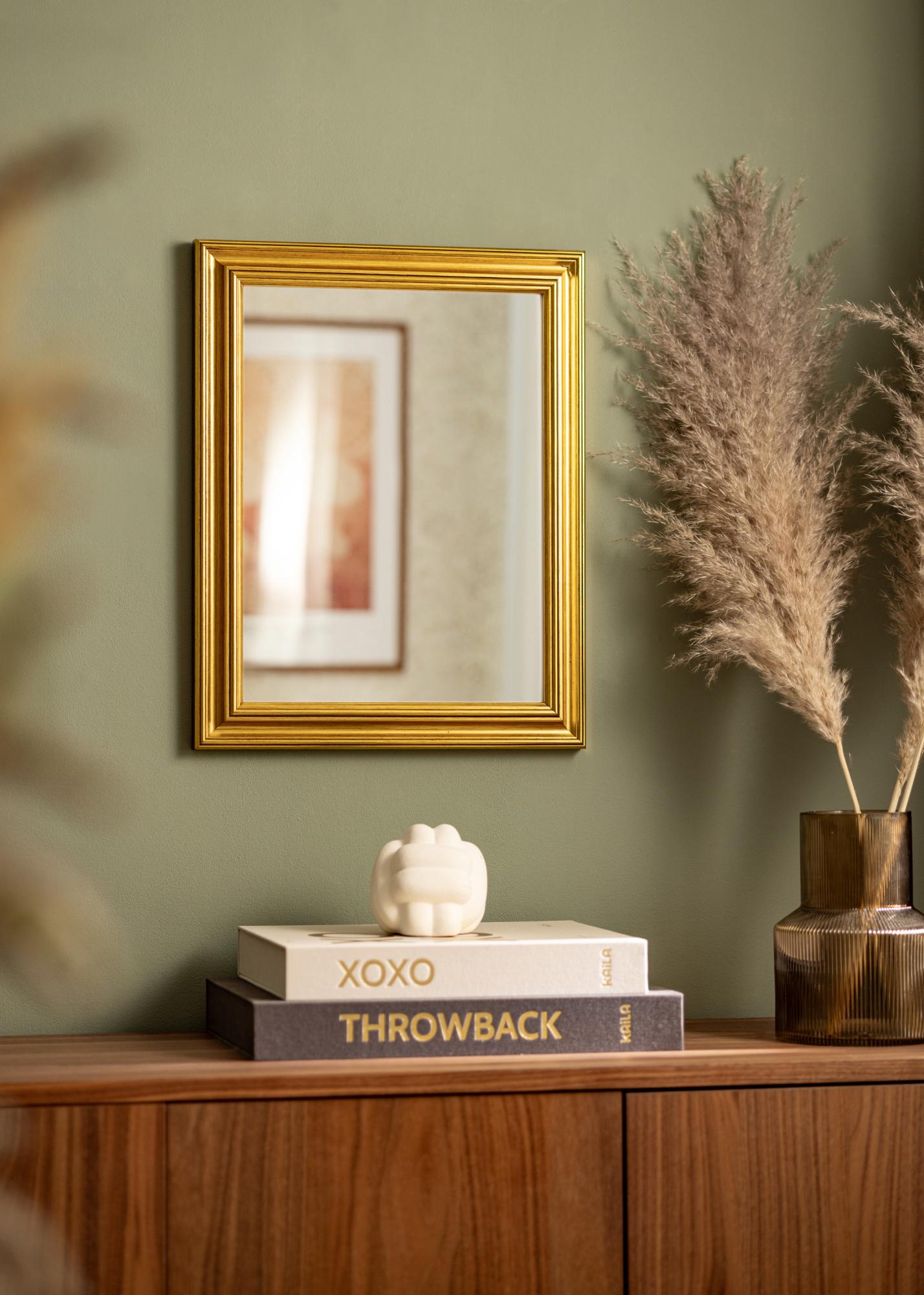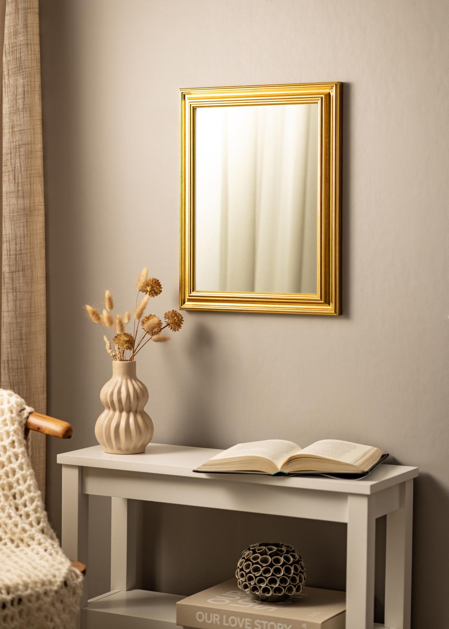 Klassisk, profilert, gullfarget speil med ramme i tre, som fremstår som håndmalt. Dette gir speilet en livlig følelse og en fin glød. Den brede rammelisten gir speilet et eksklusivt utseende, og gjør at speilet passer like bra inn i et hjem innredet med antikviteter som i et moderne hjem med en romantisk eller elegant innredning. Kombiner gjerne speilet med et par messinglampetter og bilder i gullrammer for å skape en helhetlig følelse i rommet.