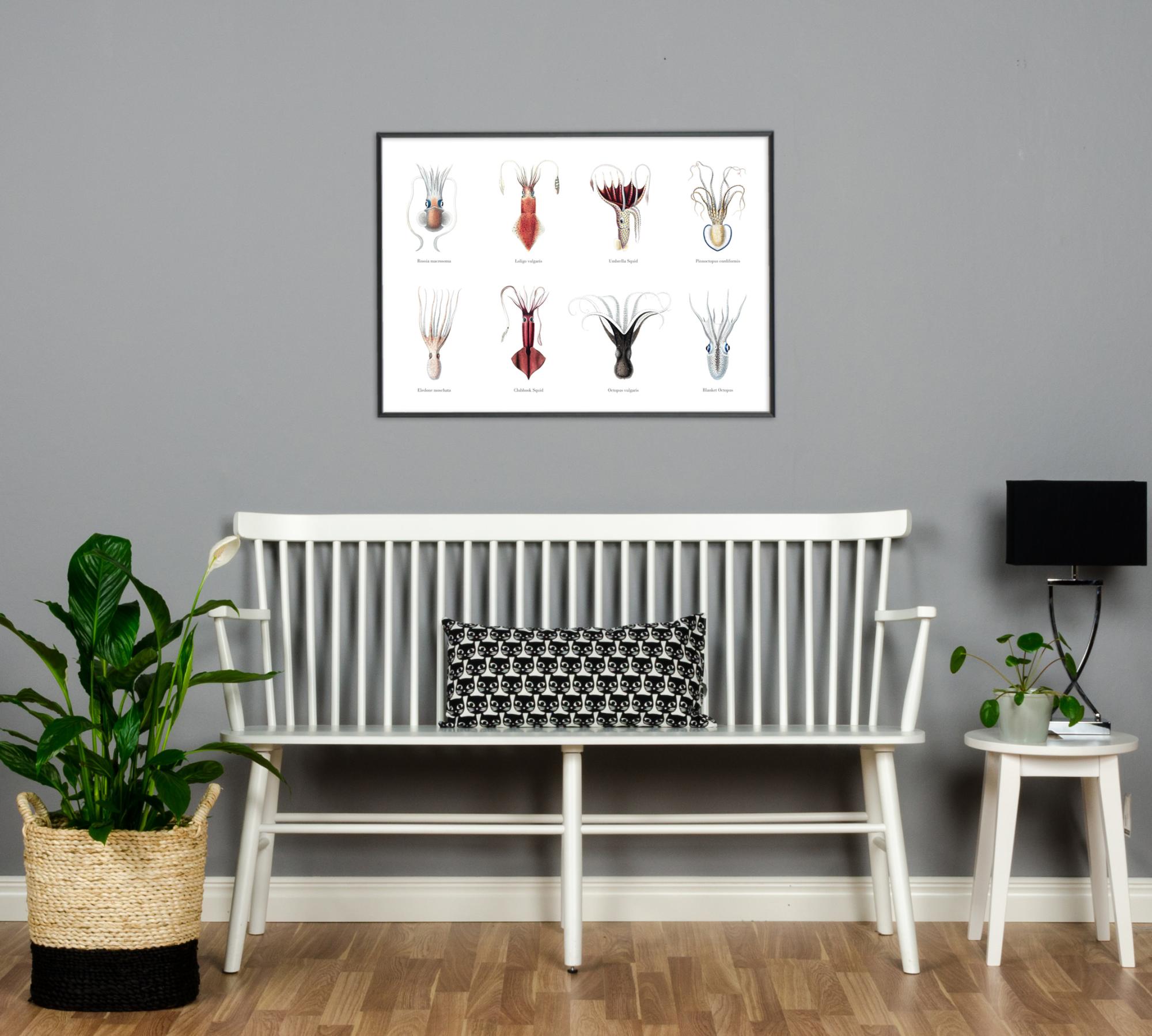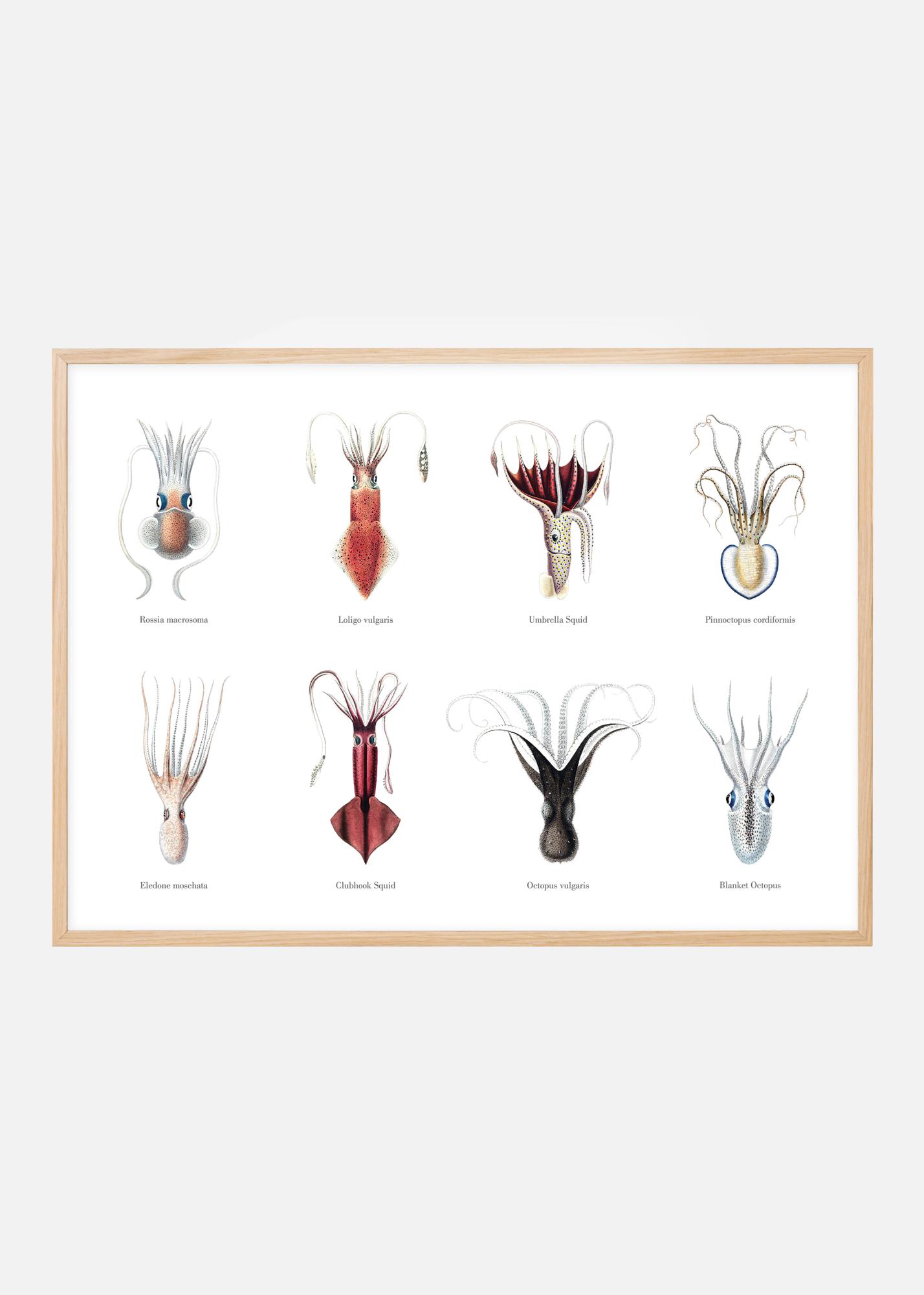 Blekkspruten er sannelig et interessant skapning. Visste du for eksempel at den har 3 hjerter? Eller at deres intelligente hjerne er bitteliten, tross at den gigantiske saken som ser ut som et hode virker å inneholde en kjempestor hjerne? Videre finnes det nesten 800 blekksprutarter! Denne fine vintageposteren viser 8 av de - ingen den andre lik,, men alle like fascinerende. De gamle tegningene har søte, velgjorte detaljer og under hver art står navnet.