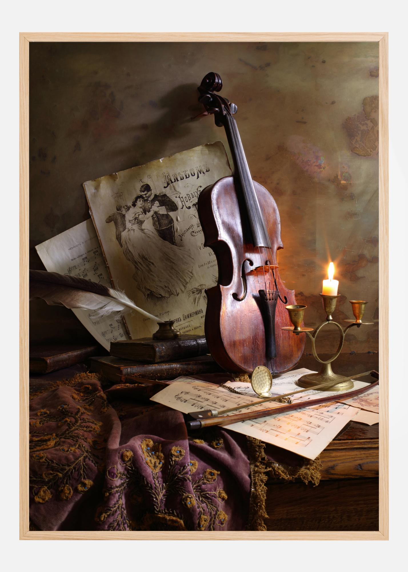 En stille liv-plakat med en fiolin og noteark. Et mykt stearinlys brenner sterkt og belyser fiolinens mahognifarge der den lener seg mot veggen. En klut, noteark, fjærpenn, bue og andre tilbehør fyller scenen for å gi en varm, rik følelse til rommet.