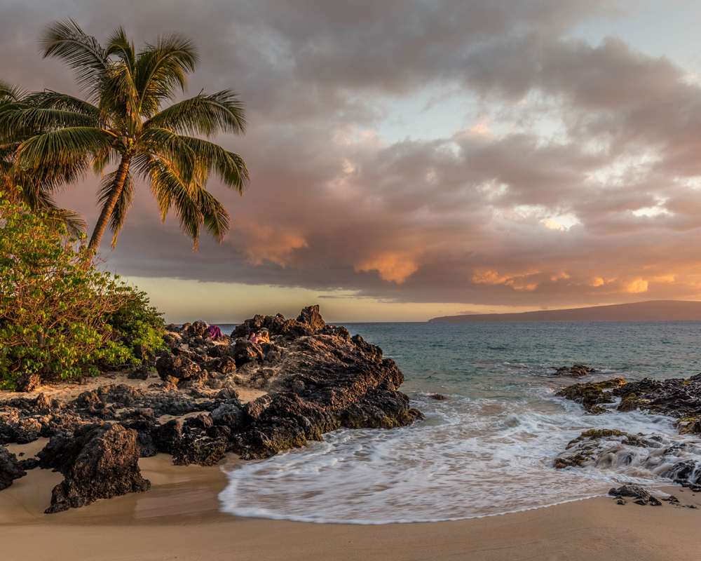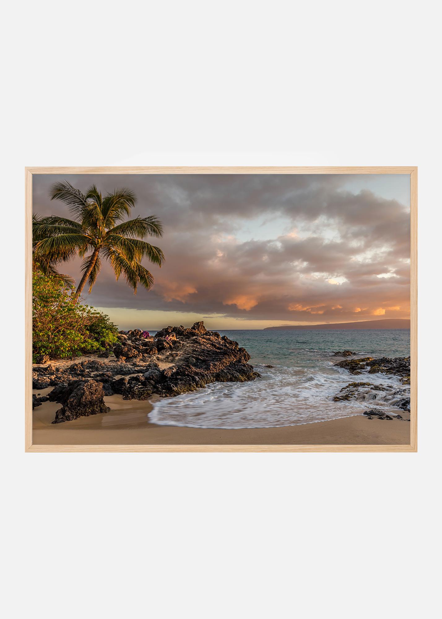 En strand i solnedgang - et vakkert motiv som er obligatorisk for en med tiki- eller tropetema. Bildet fremstiller det klassiske palmetreet som lener seg ut over vannkanten i dagens siste gyldne sol stråler. Bildet passer bra i en bilderamme med et værbitt utseende eller som har en sterk farge som passer med tiki-innredning.