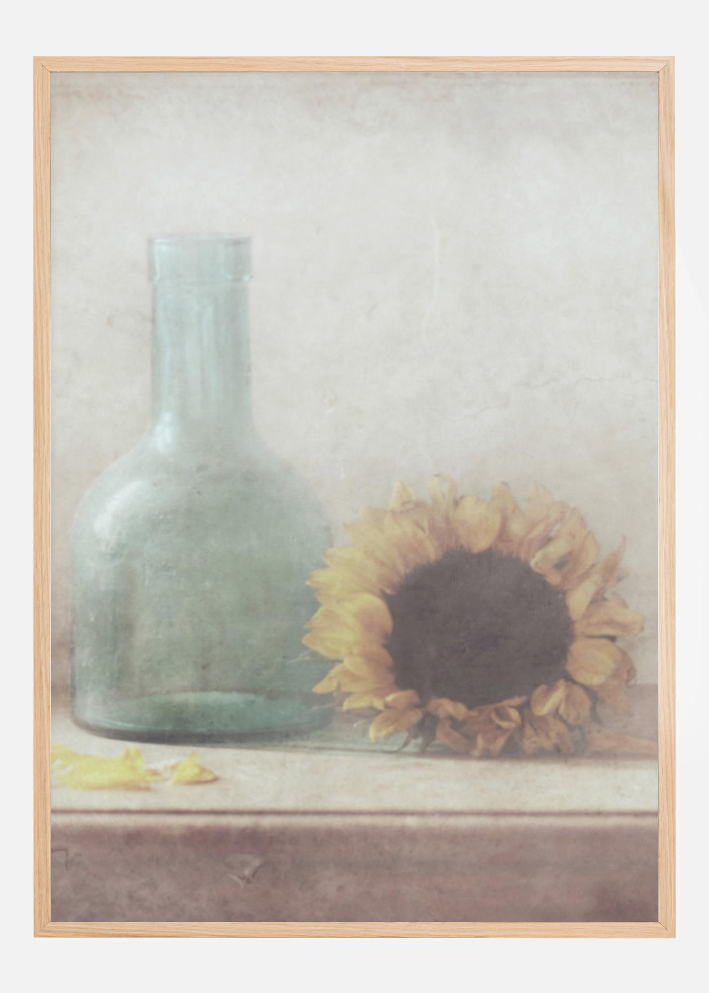 En klassisk plakat med en glassflaske og et solsikkehode. Innhyllet i en myk uskarphet, er dette stillbildet mykt og fredelig. De gule kronbladene krøller seg forsiktig mens blomsterhodet hviler på hyllen. Heng denne pastellfargede plakaten på en nøytral vegg for en beroligende effekt.