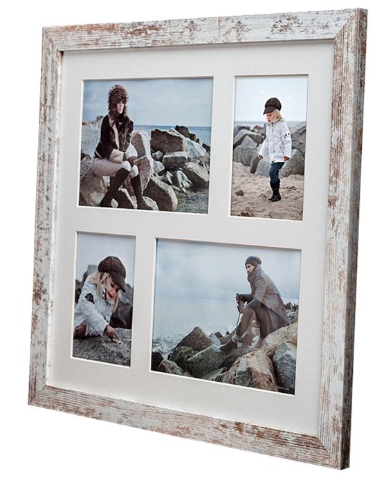 Stilig vintageramme med en bred rammeprofil med et slitt utseende i hvitt og tre. Gir en ekstra dimensjon til bildene dine, og er ideell når du vil ha en ekte vintagefølelse. Rammen har plass til 4 bilder i ulike størrelser.